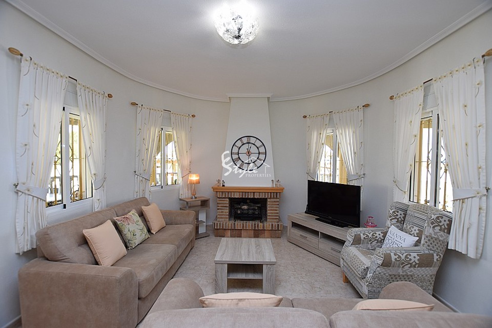 Independent villa with large pool for sale in San Miguel de Salinas, Orihuela Costa. For sale this very bright independent villa to provide a life level with lots of natural light and enjoy Mediterranean climate. It is in the sought-after area of Villas Maria, San Miguel de Salinas a quiet town with high value villas, individually designed and known as the surrounding Beverly Hills, less than 10 km from the sea and beaches. The house has a private corner plot with views of the mountains, garden areas with trees and a pool of 10x4 m2. The house has 3 bedrooms, 3 bathrooms, open kitchen, large living room, fireplace and exit to the covered terrace where you can have a perfect breakfast. House has a garage with storage space.