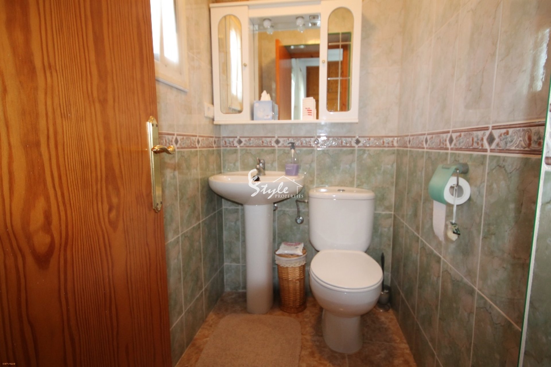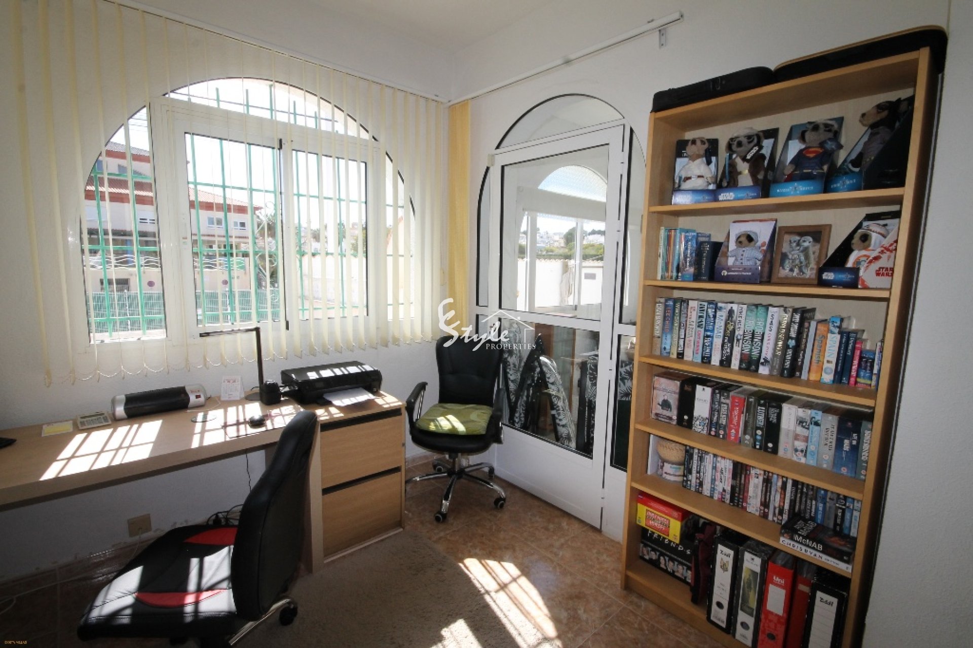 We offer for sale this cosy traditional villa located in quiet urbanization Eagles Nest, set between Villamartin and San Miguel de Salinas. This traditional style villa offers large plot with a private pool and a house with three spacious bedrooms, a large airy lounge zone and kitchen and 2 and a half bathrooms. An enclosed terrace room leads into the light and spacious lounge with a gas fireplace. The open plan kitchen is adjacent, with a door into the study.