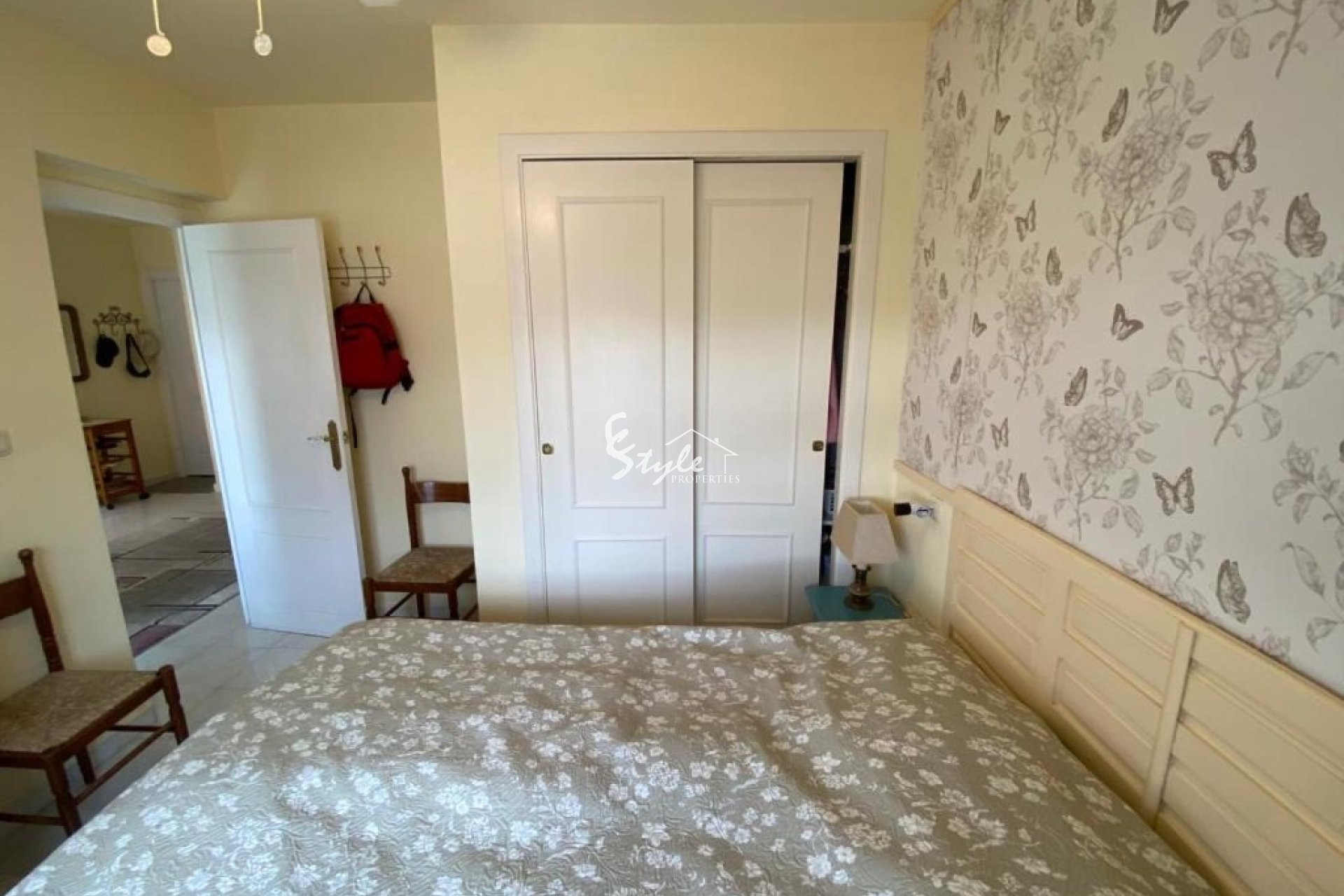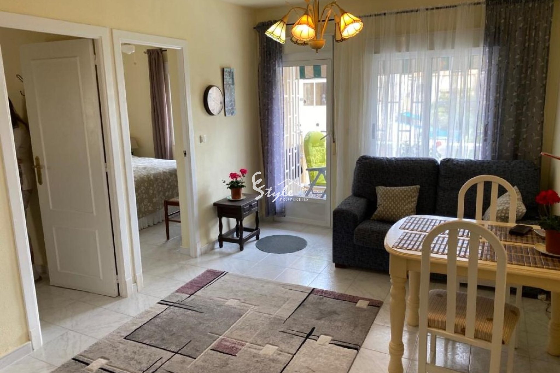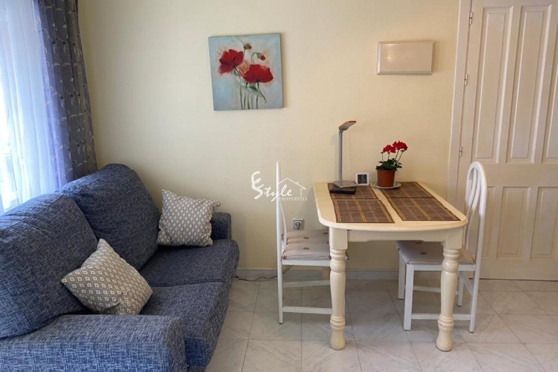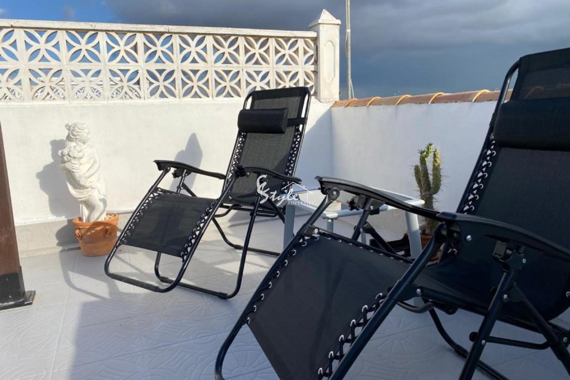 We have a top floor bungalow with private solarium for sale in the El Limonar Residential, Torrevieja, Altos de Limonar. The house total 40 m2 has terrace with nice view of the area. The property has 1 bedroom with fitted wardrobes, bathroom, open kitchen and living room. This bungalow overlooks the community garden and green areas. This house fully furnished and ready to move into. It has large and green common areas with swimming pool and gardens. It is located about 3 kilometres from the sea and close to many services.