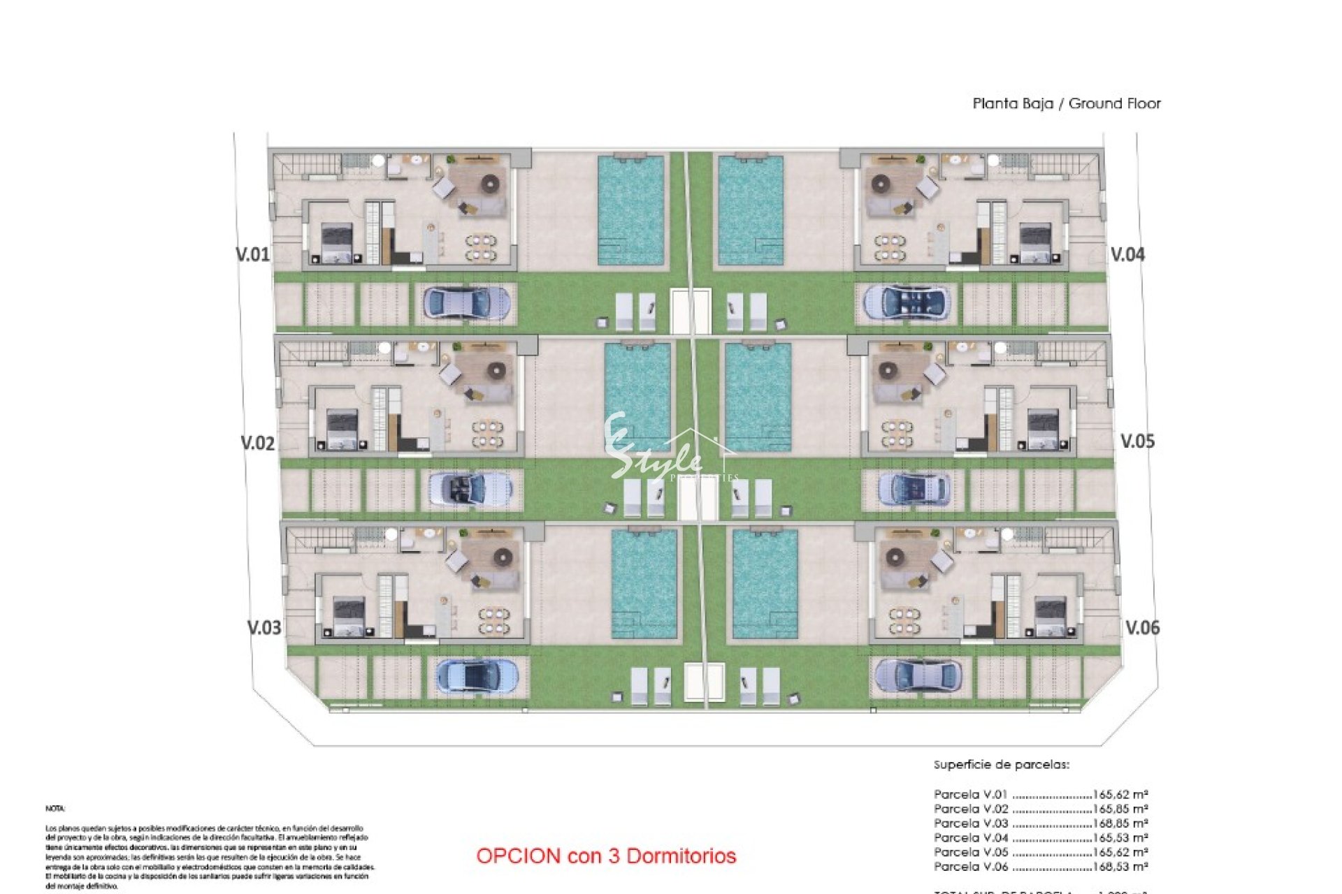 Independent Villas located in a New residential luxury complex near the sea and beaches. Each property has a private pool with a green area and a parking place with porch. They have optional 2 or 3 bedrooms, 2 or 3 bathrooms, living room, open kitchen and terrace. All houses have a private garden and a private pool, terrace with solarium. Pre-installed air conditioning ducts.