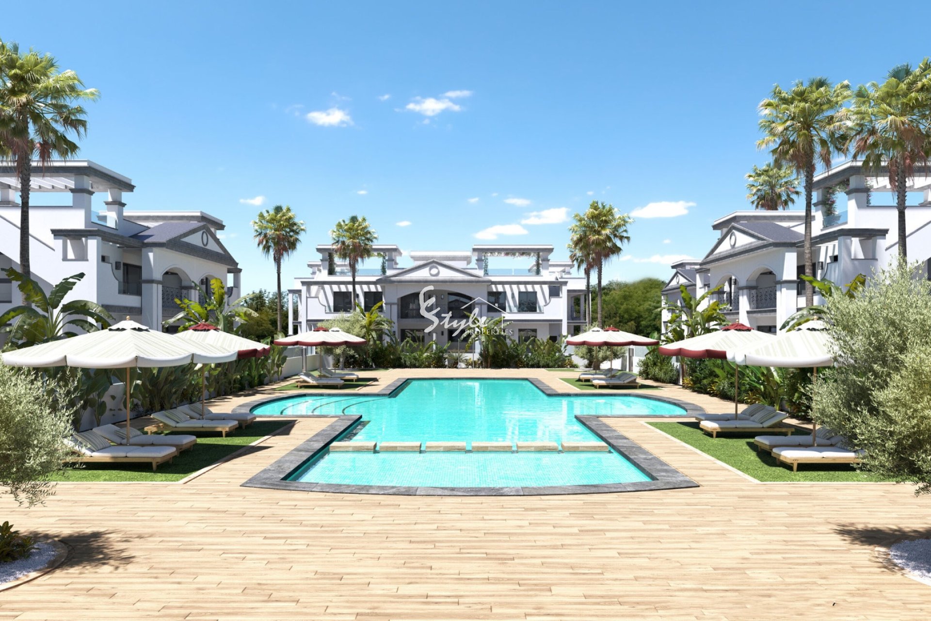 The apartments are located in a new build development with a very unique and recognizable style. It is an atrium-style architecture, with all the two storey buildings located around the long communal pool, which means each apartment has a beautiful view from its upper private solarium or a garden. The interior of the apartments is composed of 87 square meters distributed in 2 bedrooms, 2 bathrooms, light airy salon with a modern integrated kitchen and private solarium of 75 square meters.