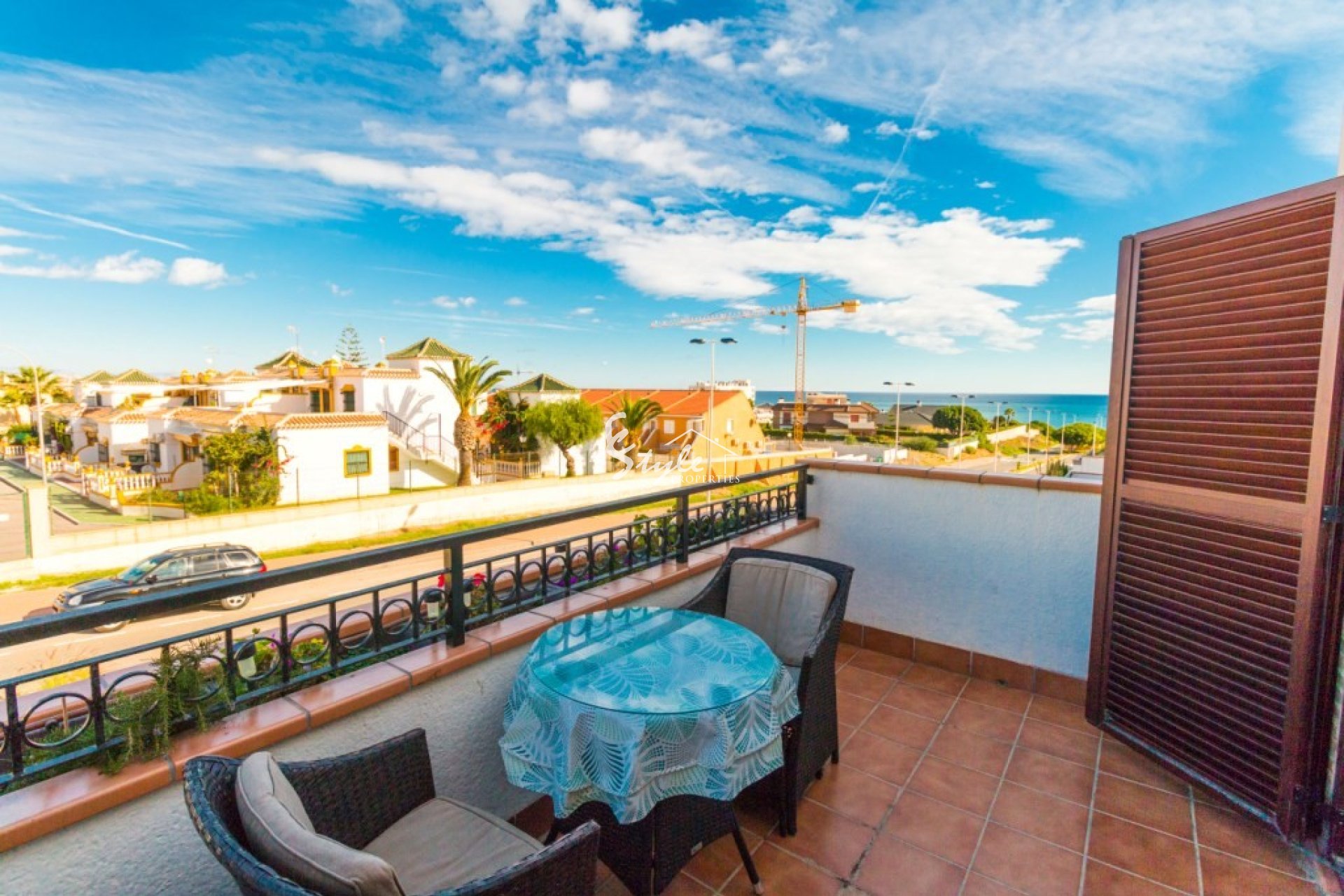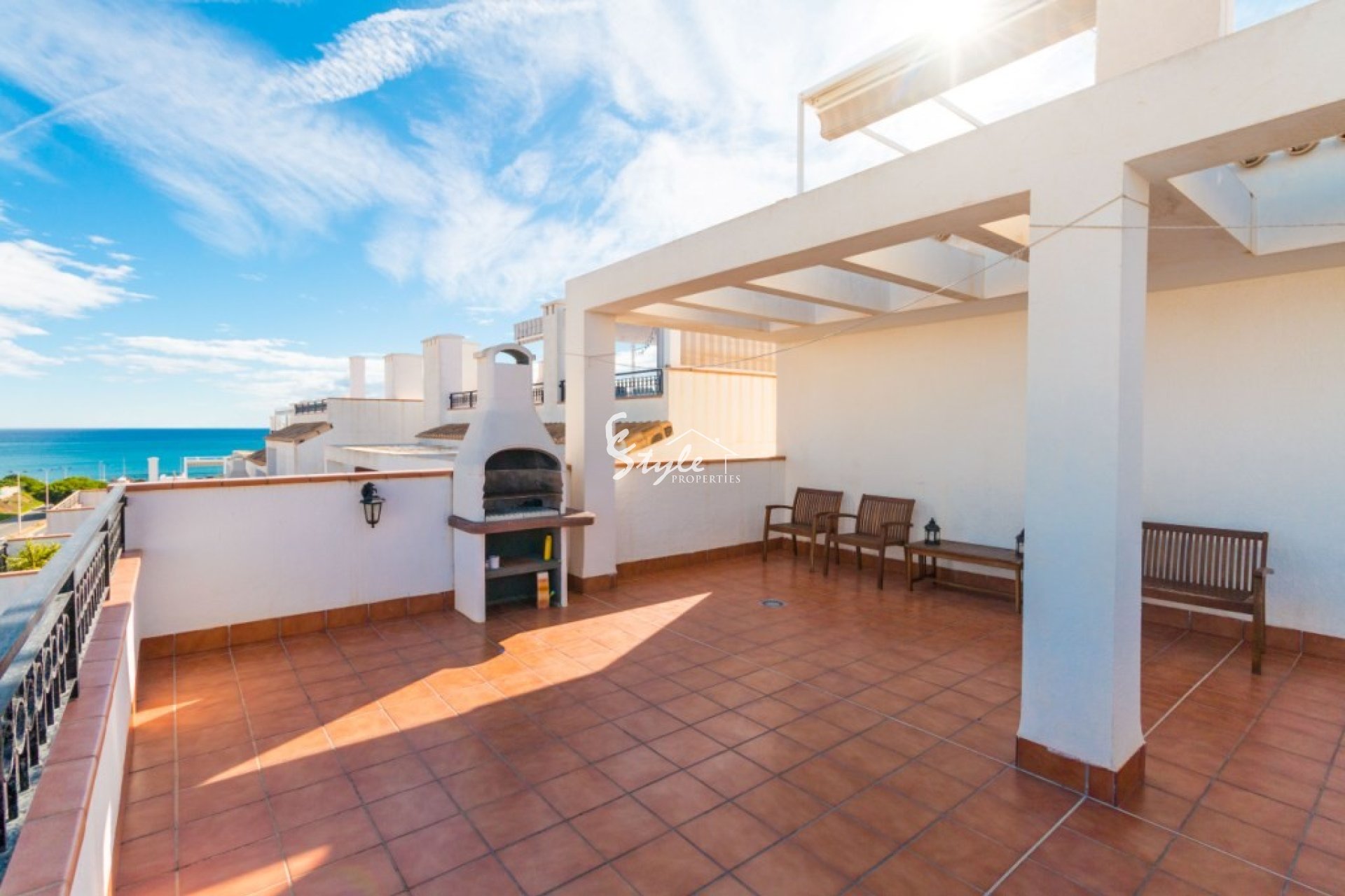 Superb south facing light first floor bungalow for sale in La Mata, AZUL BEACH II residential, next to the sea and 200m to the beach. This house has private solarium, 2 bedrooms, 2 bathrooms, bright living room, American kitchen. The property has an open terrace and private solarium with beautiful sea views. Apartment is located within a gated complex with lovely community garden and pools. Sold furnished, except personal items, with A/A, it is ready to move in and live. A few meters from all services and just 200 meters from the sandy beach and the promenade. This property has a parking place and storage room!
