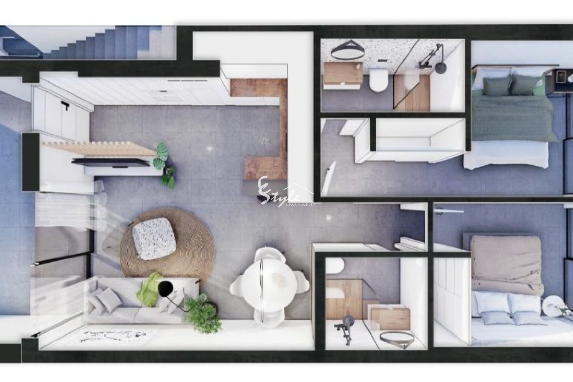 We offer for sale this new built apartments located in residential complex with swimming pool. The apartment consists of a spacious living-dining room, open kitchen, 2 bedrooms, 2 bathrooms. Apartments on the ground floors have private garden, on the top floor - terrace and solarium.