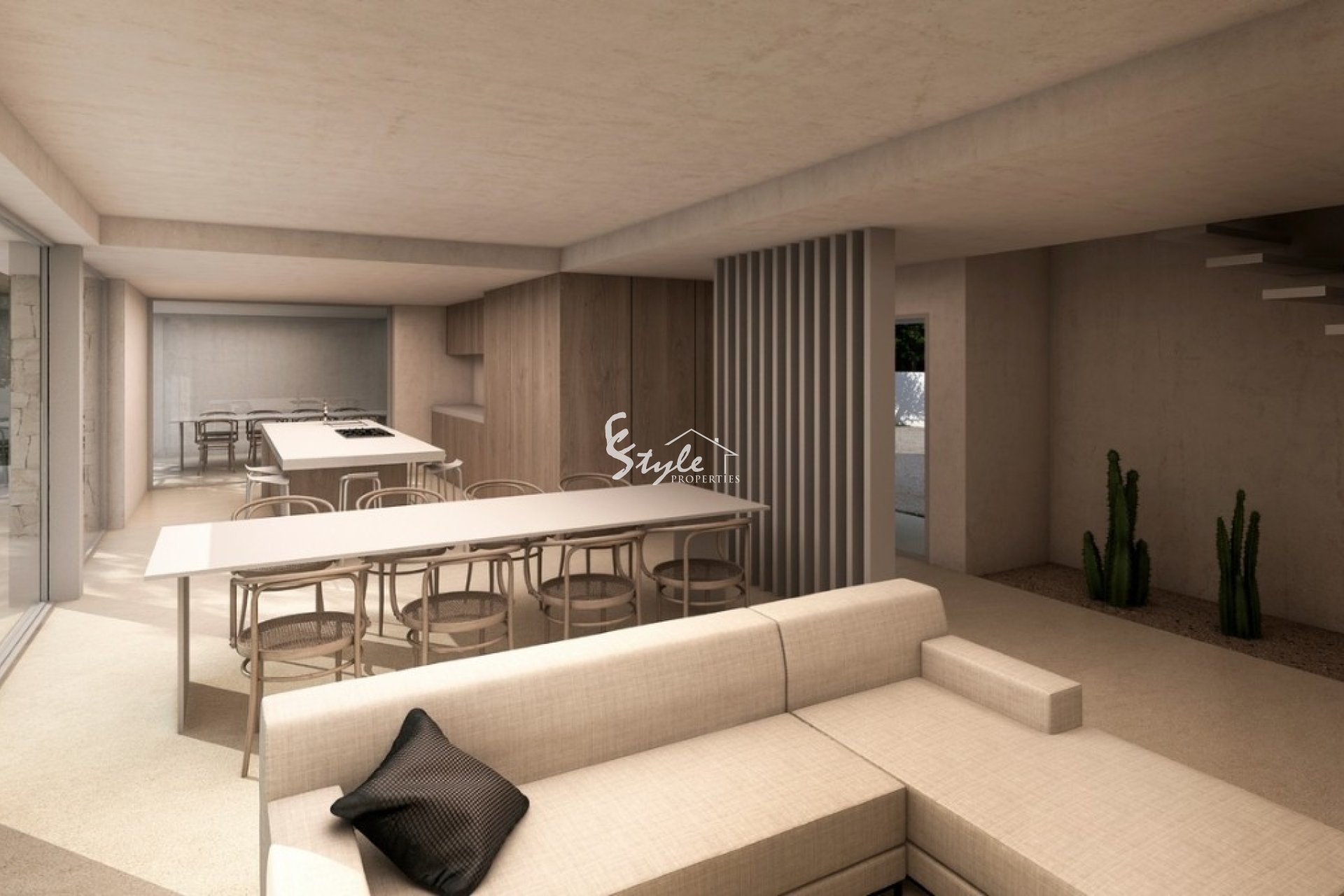 Of course it includes a modern kitchen with island and all appliances, Aerothermal air conditioning system (underfloor heating and ducted air conditioning), bathroom furniture, wall-mounted taps, technical LED lighting, porcelain floors in large format, complete garden with automatic irrigation system.