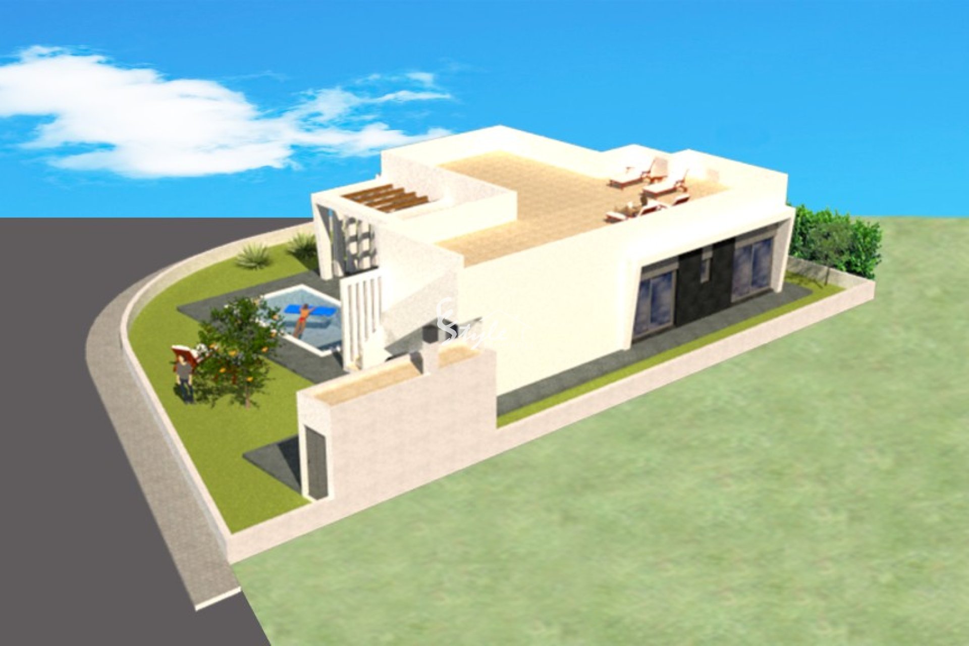 Villa with 3 bedrooms and 2 bathrooms, the spacious living and dining room opens onto the open American kitchen. There is also a parking space, the swimming pool and solarium. Finished garden, with gravel and ornamental plants.This model can also be built on one floor, just as the number of rooms and bathrooms can vary according to the taste of the buyer. See different options.