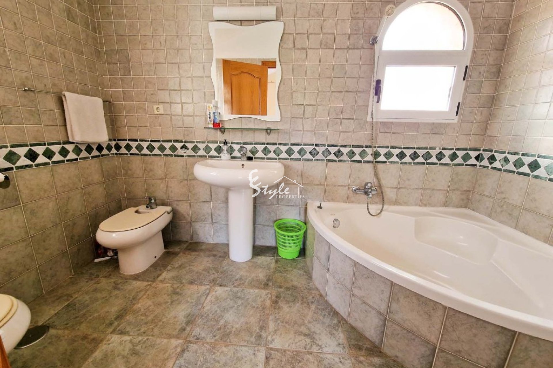 We have beautiful detached villa in a Mediterranean design at some 850 m distance from a white sandy beach for sale in Playa Flamenca. The house is located near the sea, close to the beaches of Orihuela Costa and has private plot with lovely gardened areas, nice pool, and barbeque area. Property 200 m2with an area plot of 350 m2 has 4 bedrooms and 3 bathrooms, large living/dining room, open style kitchen, porch, and terrace with surrounding views of garden areas. The house is sold with furniture and has AC and central heating. Ideal to live all year around or spend a summer vacation.