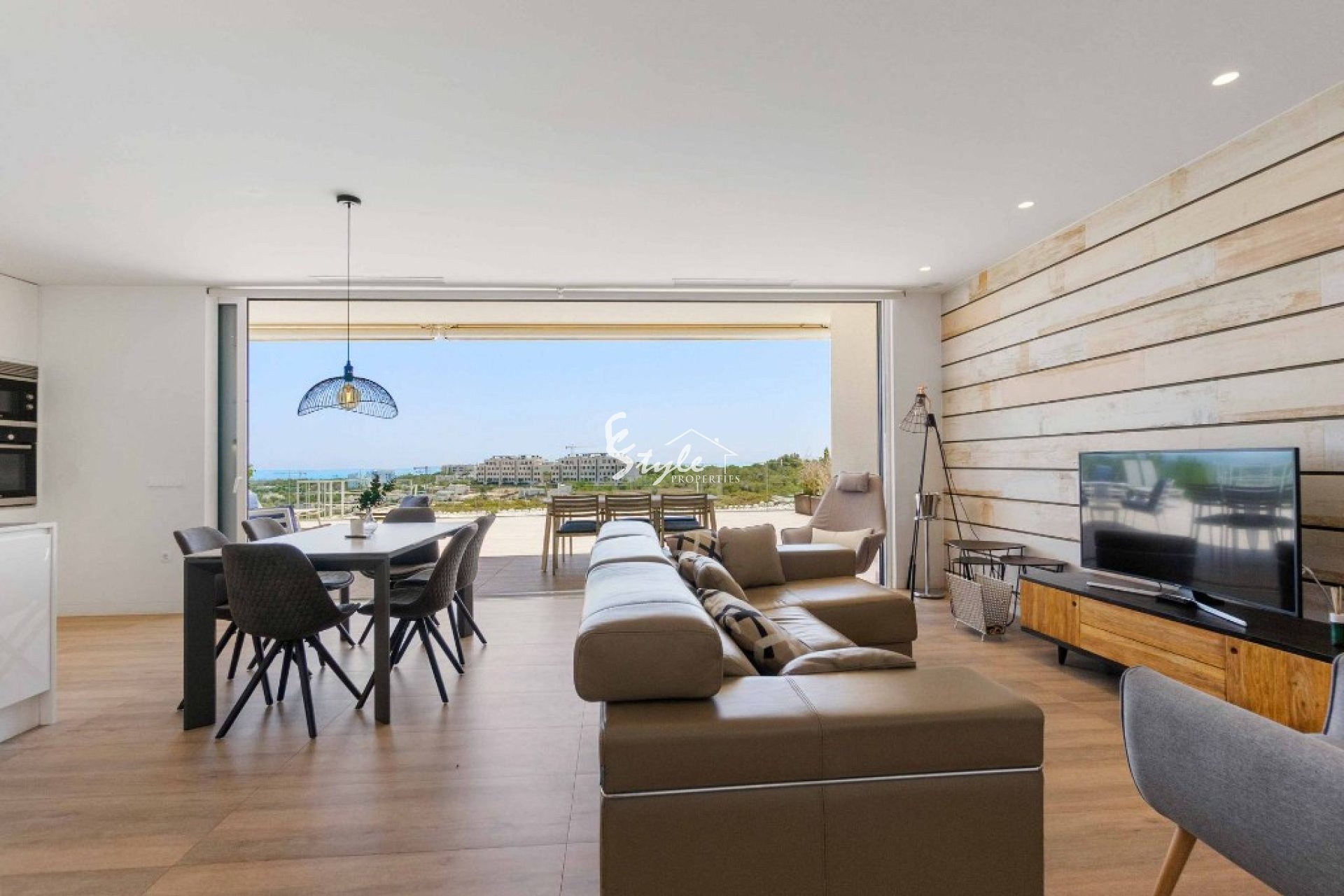 For sale an elegant ground floor apartment providing a modern and luxurious lifestyle, perfectly and thoughtfully positioned into the landscape amongst the pine trees, surrounded by gardens and parks a few meters from the golf course in Las Colinas de Campoamor. This PRESTIGIOUS property has perfect cohesion between the interior and exterior space, the interior elegance combines with the exterior style. The apartment 115 m2 is distributed on 3 double bedrooms with panoramic views that are presented are serene sanctuaries with those warm and summer nights cooled with air conditioning that guarantee a restful sleep. The modern open kitchen is fully equipped and very well integrated in the living room and has access to the terrace and magnificent views. With large windows throughout the house, you benefit from lots of natural light and sunny days.
