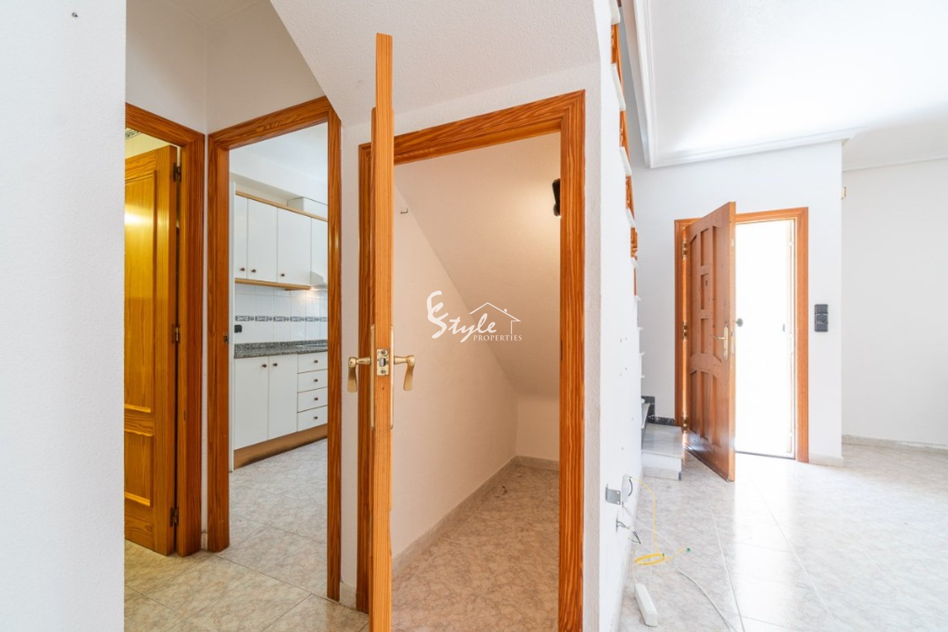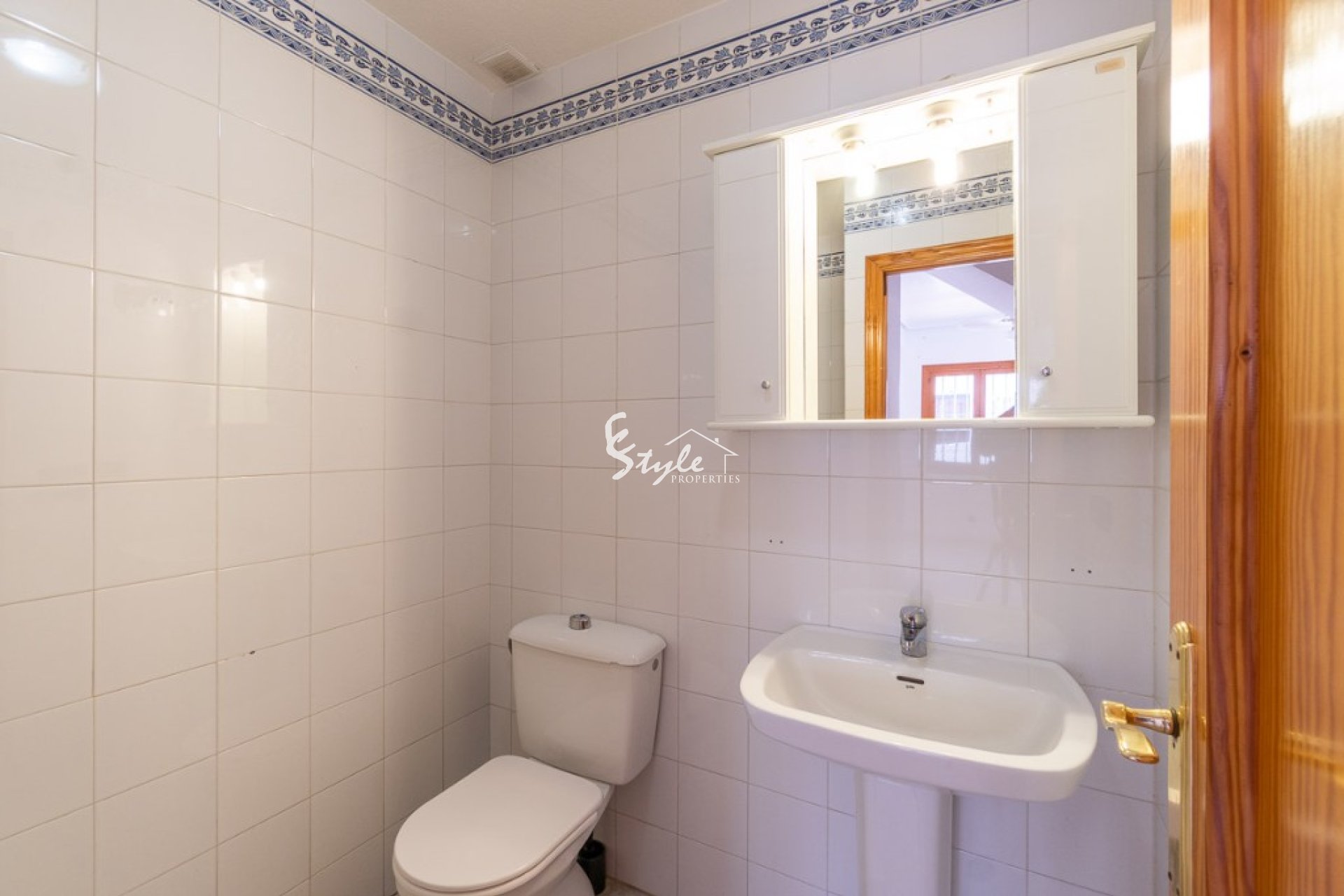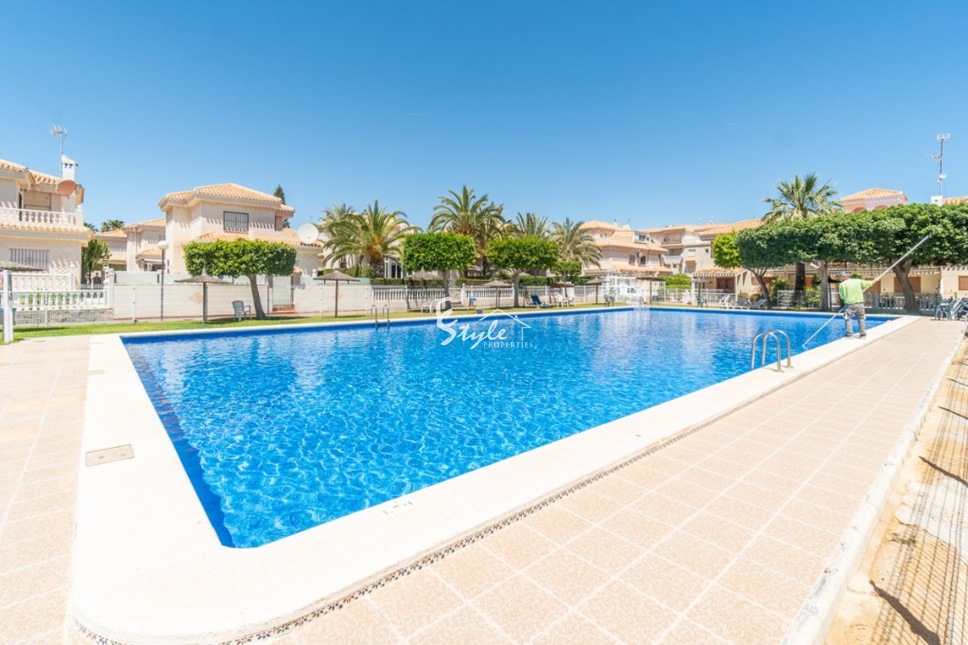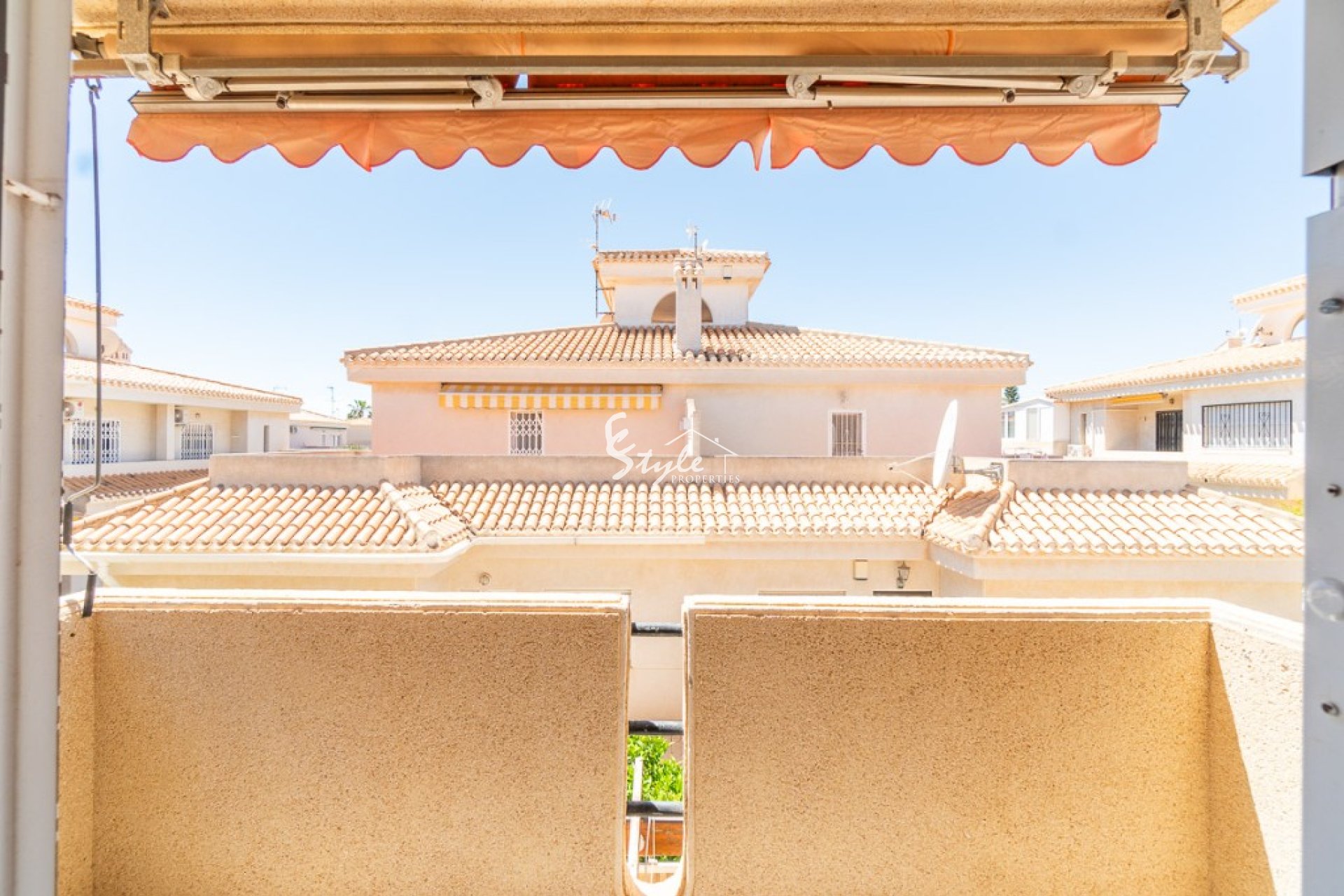 We have a townhouse for sale in the Residential, Playa Flamenca. Total 100 m2 built with porch area. The house has 2 bedrooms with fitted wardrobes, 2 bathrooms, kitchen, living room, terrace. Facing south, this wonderful townhouse overlooks the community garden, pool and green areas. It is located about 1 kilometre from the sea and close to many services. The house originally had 3 bedrooms, but at the time the ground floor bedroom was transformed into the aforementioned independent kitchen and therefore although it now only has 2 bedrooms, the size of almost 90 m2 corresponds to a larger home, therefore. The living-dining room is much larger than usual in this type of home. The property also has underfloor radial heating for the few weeks of cold winter in our area.