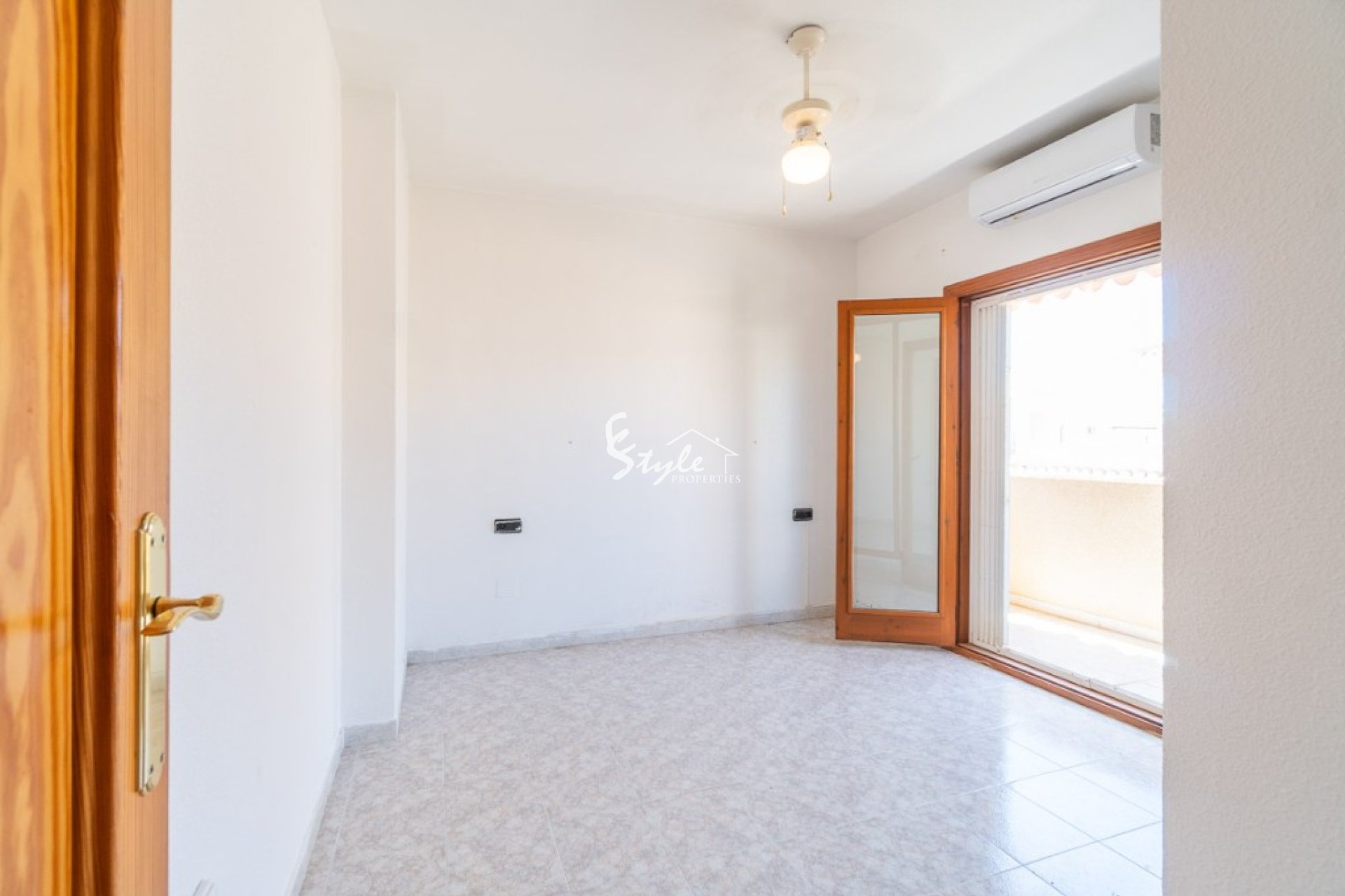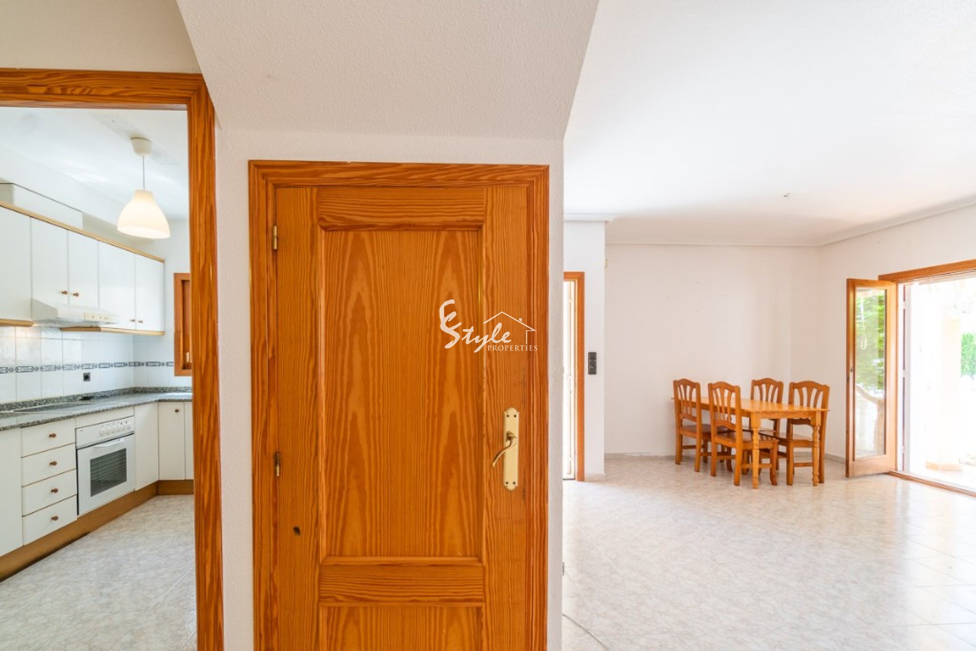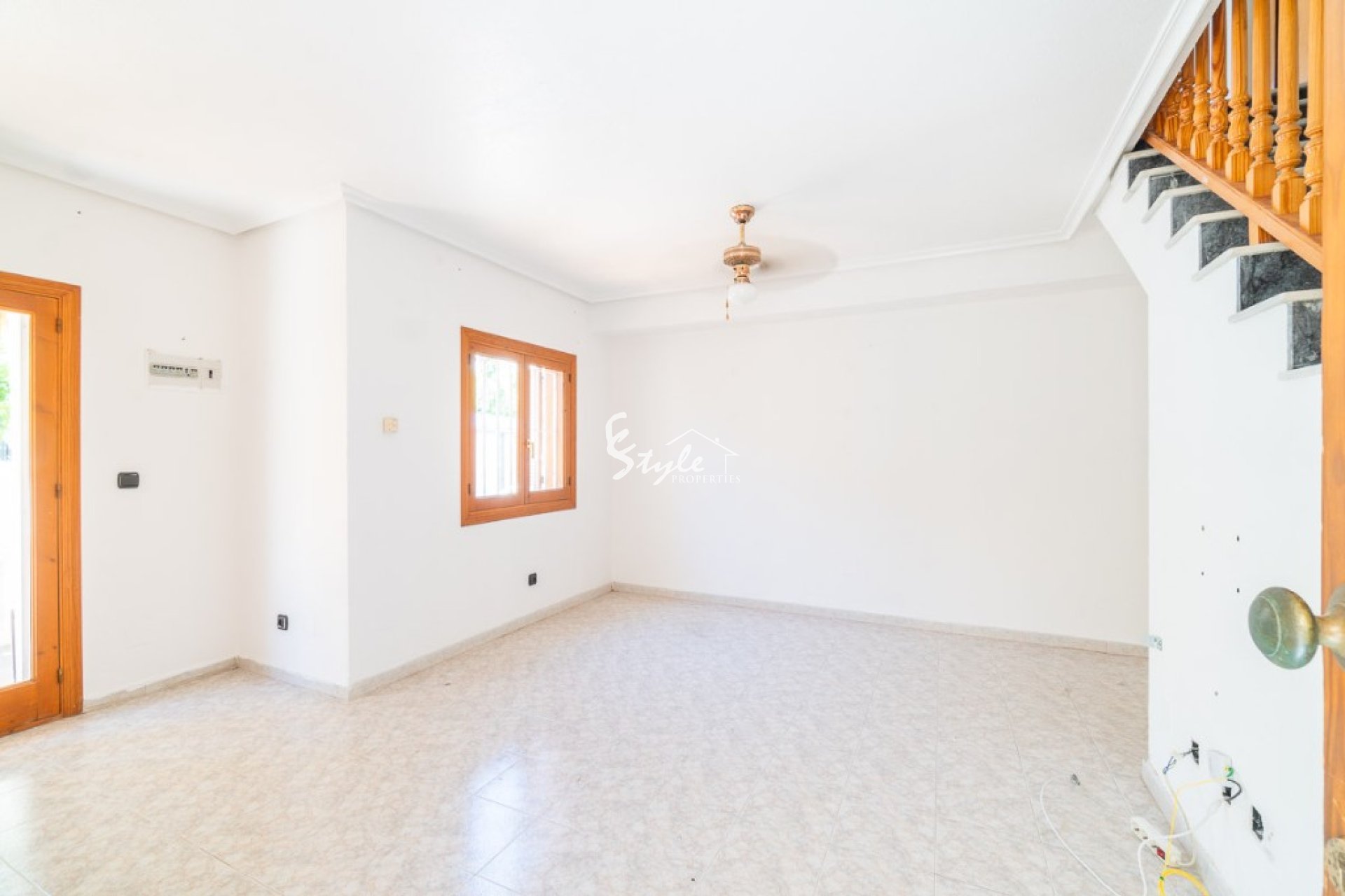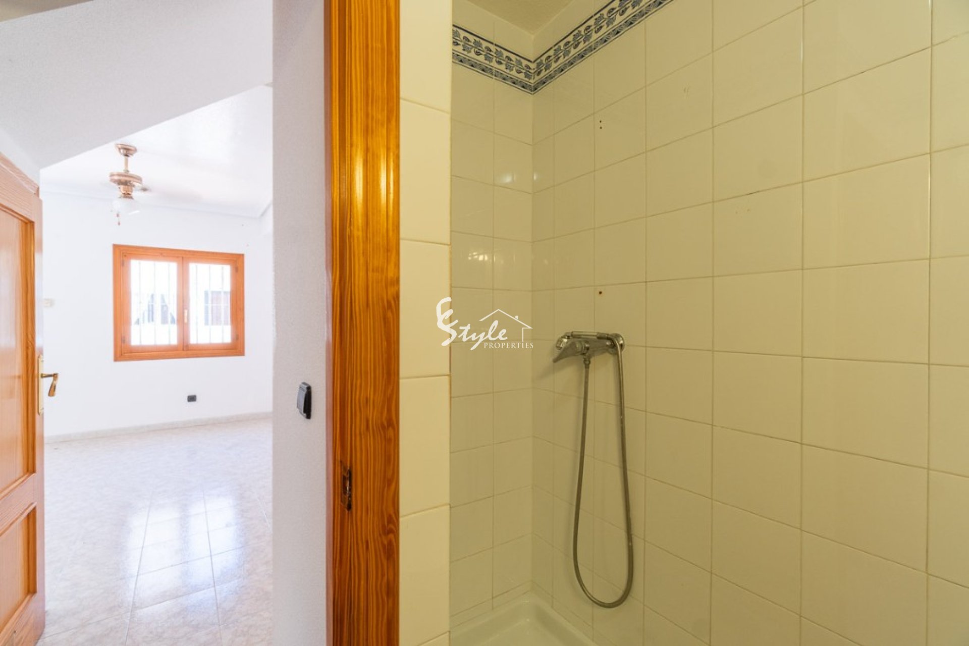 We have a townhouse for sale in the Residential, Playa Flamenca. Total 100 m2 built with porch area. The house has 2 bedrooms with fitted wardrobes, 2 bathrooms, kitchen, living room, terrace. Facing south, this wonderful townhouse overlooks the community garden, pool and green areas. It is located about 1 kilometre from the sea and close to many services. The house originally had 3 bedrooms, but at the time the ground floor bedroom was transformed into the aforementioned independent kitchen and therefore although it now only has 2 bedrooms, the size of almost 90 m2 corresponds to a larger home, therefore. The living-dining room is much larger than usual in this type of home. The property also has underfloor radial heating for the few weeks of cold winter in our area.