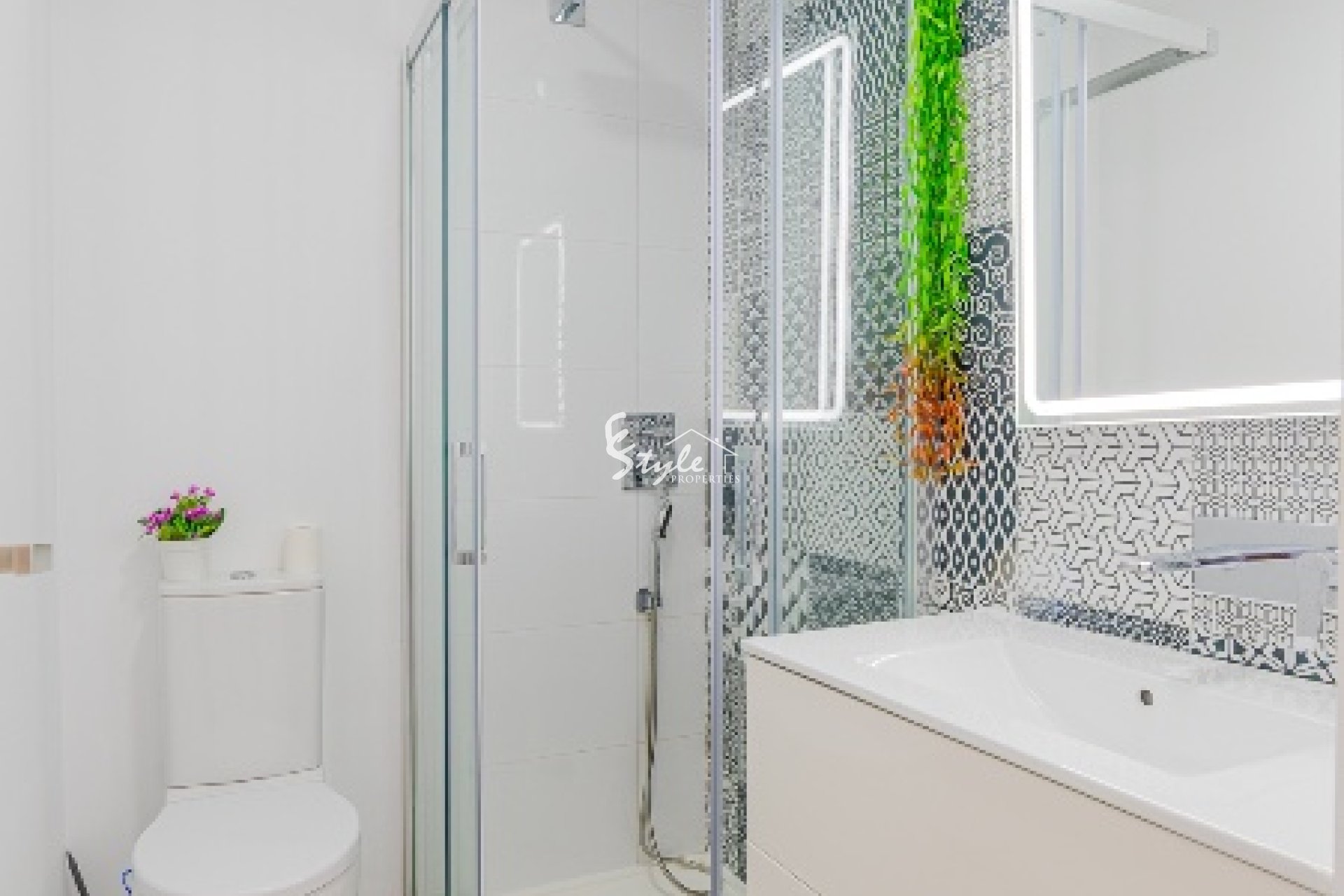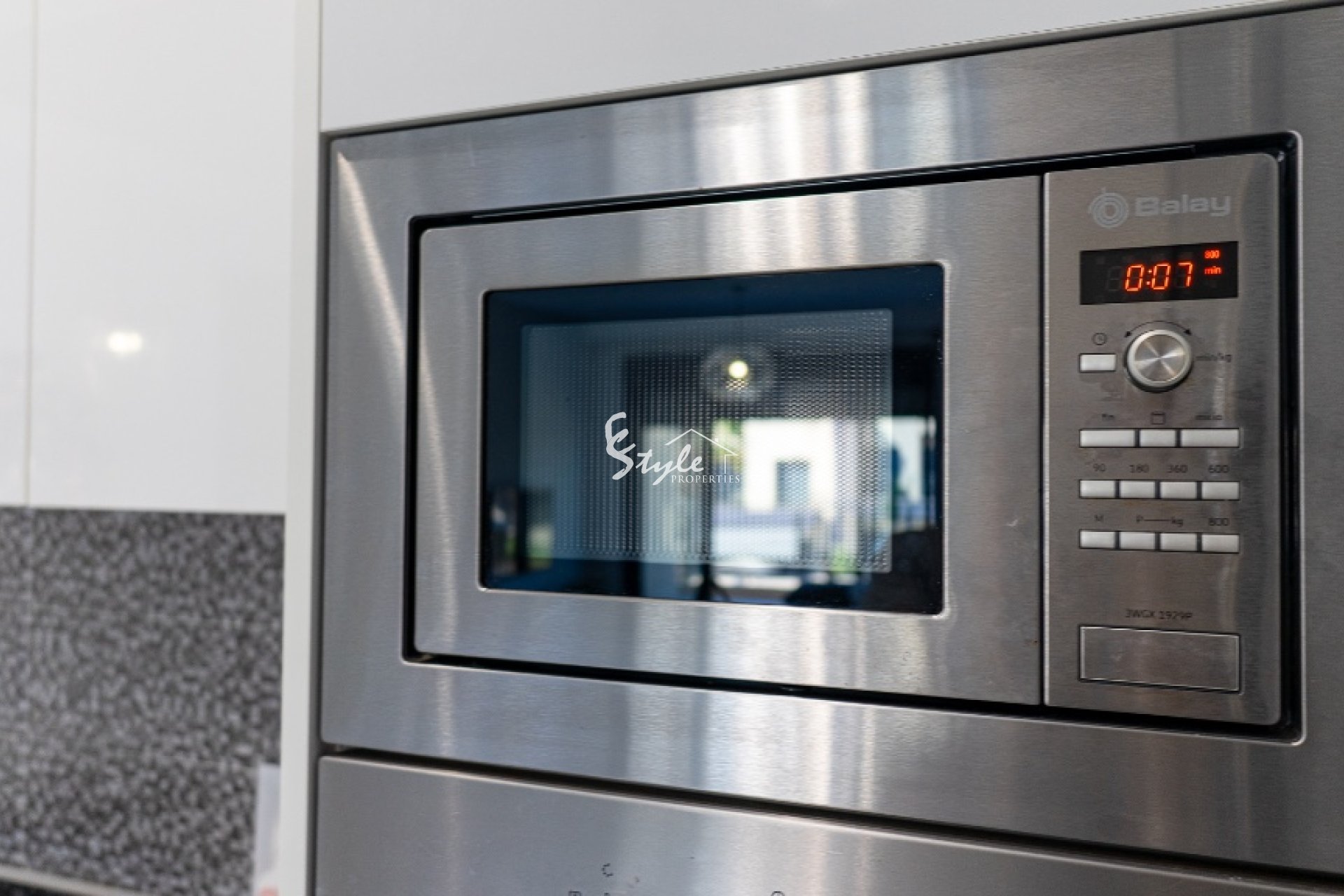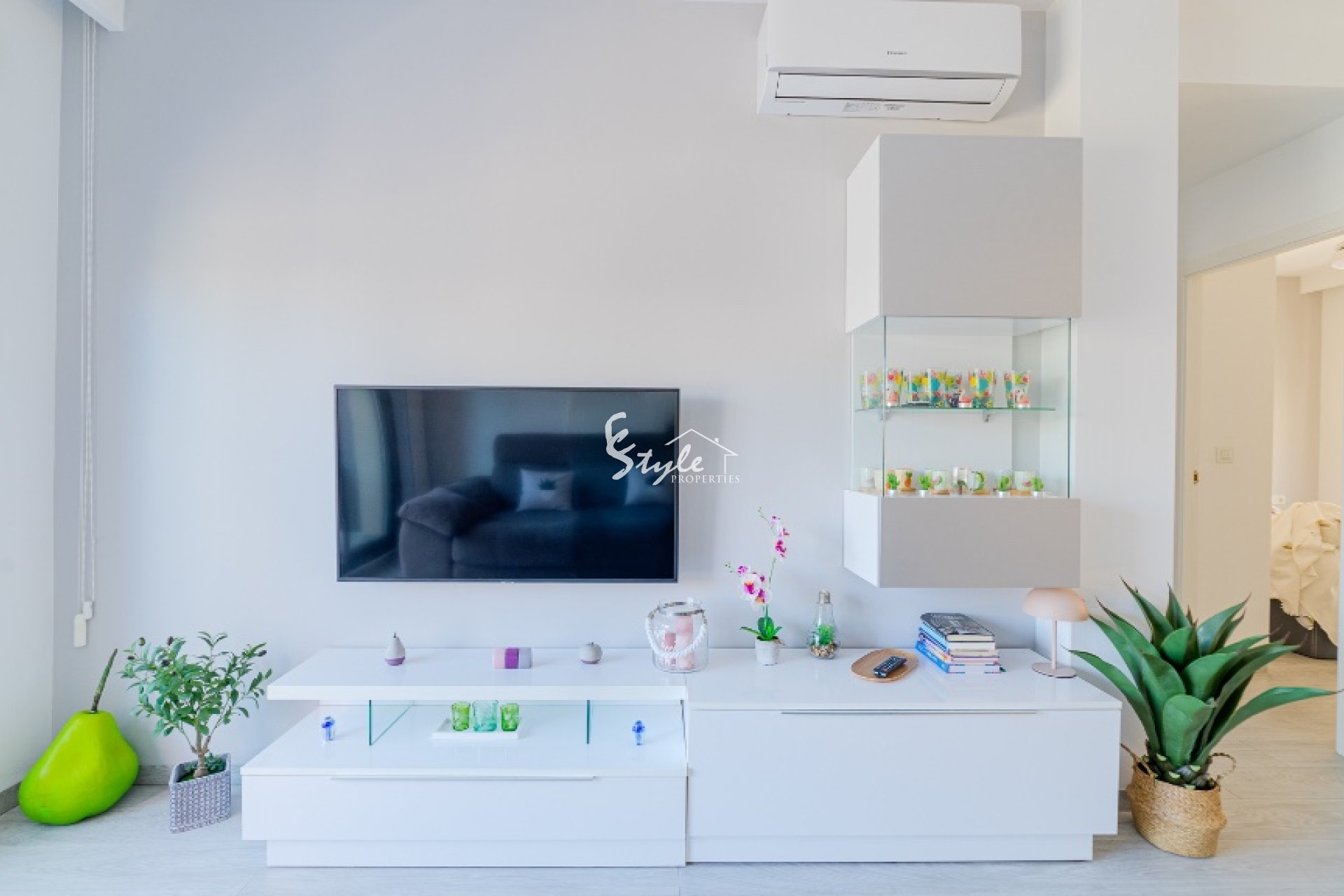 Апартаменты имеют 2 спальни, 2 ванные комнаты, гостиную, кухню открытого плана, террасу с видом на бассейн и солярий с видом на море. . Жилой комплекс построен по современным стандартам, с использованием материалов высокого качества. С помощью специально разработанного дизайна в квартире установлены термическая и акустическая изоляция, кондиционеры воздуха, окна с двойными стеклопакетами и жалюзи . Квартира продается с мебелью и бытовой техникой