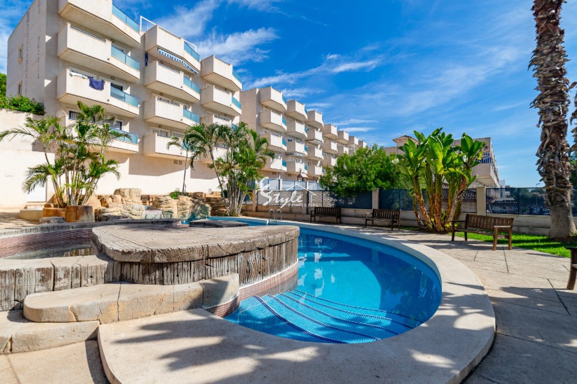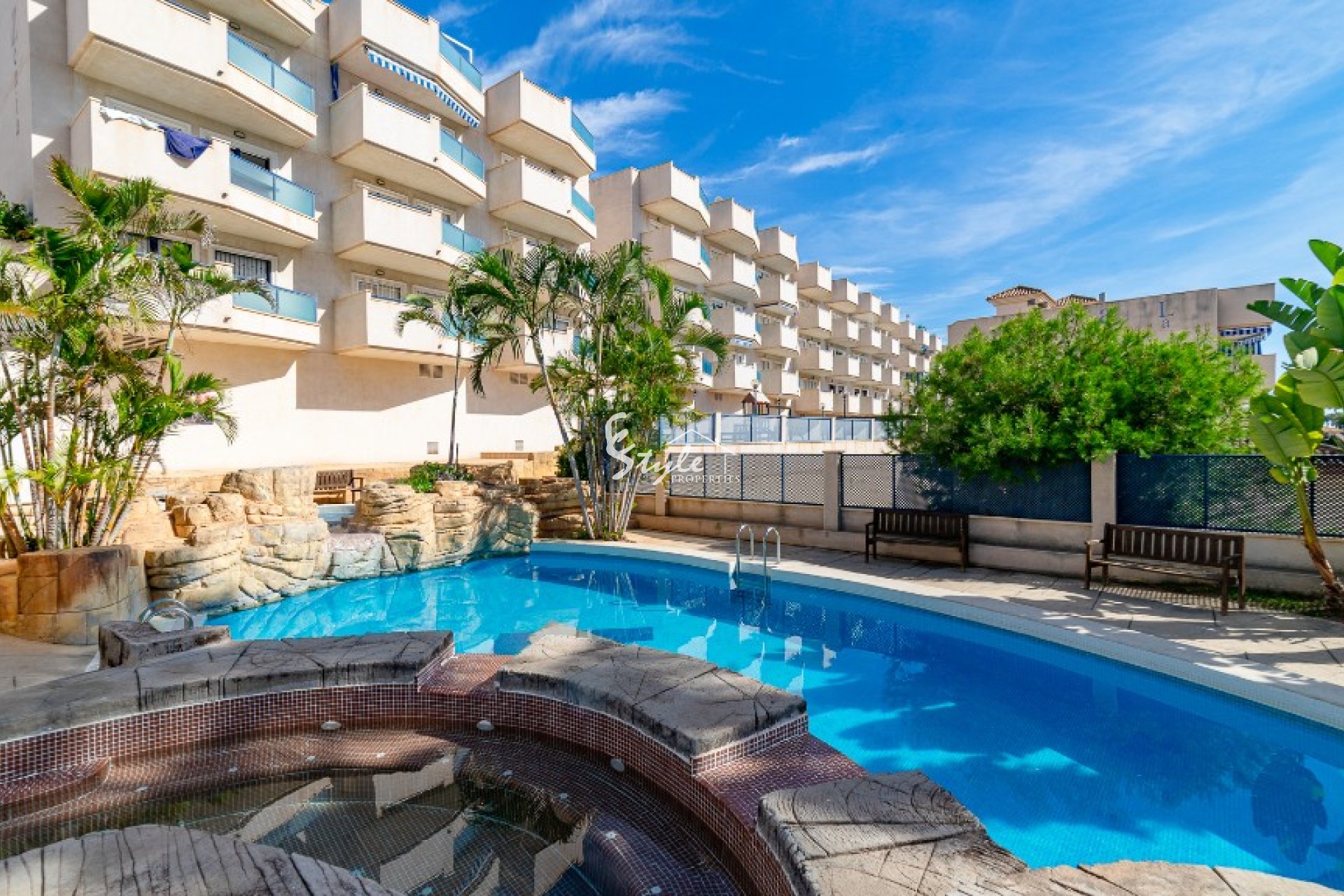 Жилой комплекс находится в хорошем состоянии и предлагает своим жильцам общий бассейн, парковочные места, детскую площадку, зоны отдыха и всё необходимое для комфортной жизни.