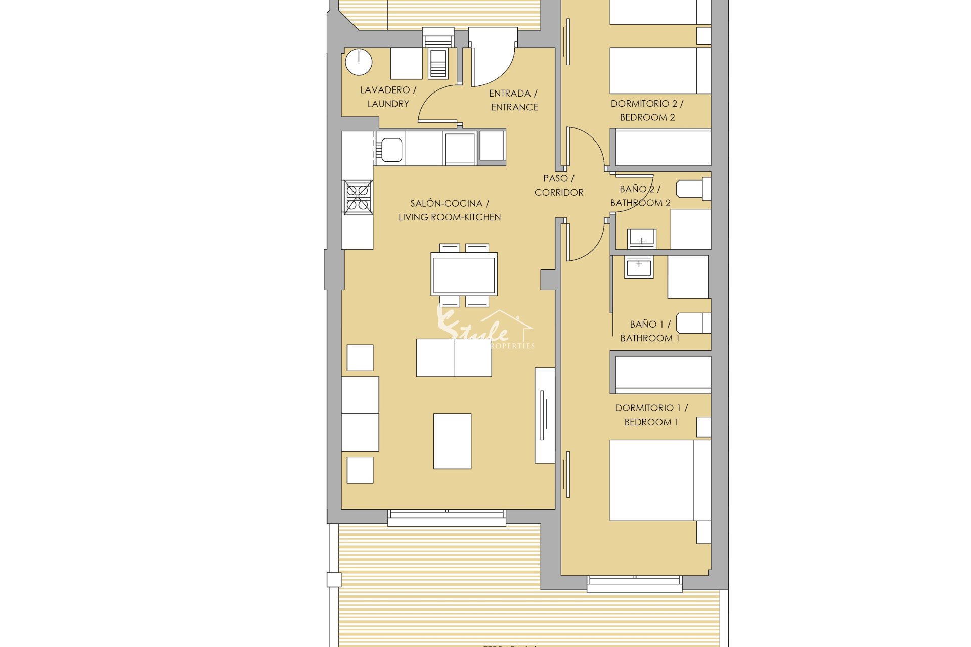 Интерьеры жилья тщательно спроектированы для обеспечения комфорта и функциональности. Апартаменты, высокие и низкие бунгало доступны в конфигурациях с 2 или 3 спальнями, все с 2 ванными комнатами, что гарантирует комфорт для семей разного размера. Недвижимость оснащена встроенными шкафами, что оптимизирует пространство для хранения и поддерживает порядок. Керамический пол придает современный вид и легко поддерживается, что идеально для современного образа жизни. Кроме того, жилье оборудовано кондиционером и предварительной установкой для кондиционера, обеспечивая приятную атмосферу круглый год.