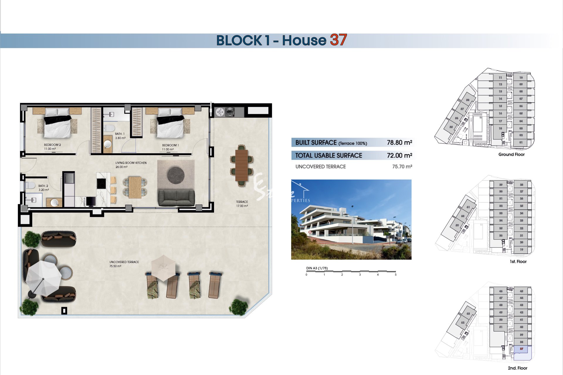 Внешние пространства этих домов спроектированы для обеспечения зоны отдыха и наслаждения на свежем воздухе. Каждая недвижимость имеет частную террасу, идеальную для наслаждения средиземноморским климатом. Кроме того, первые этажи имеют частные сады, предоставляя личное зеленое пространство для любителей природы. Пентхаусы включают солярий, идеально подходящий для принятия солнечных ванн в уединении. Близость к морю, всего в 1 километре, позволяет наслаждаться захватывающими видами и морским бризом.