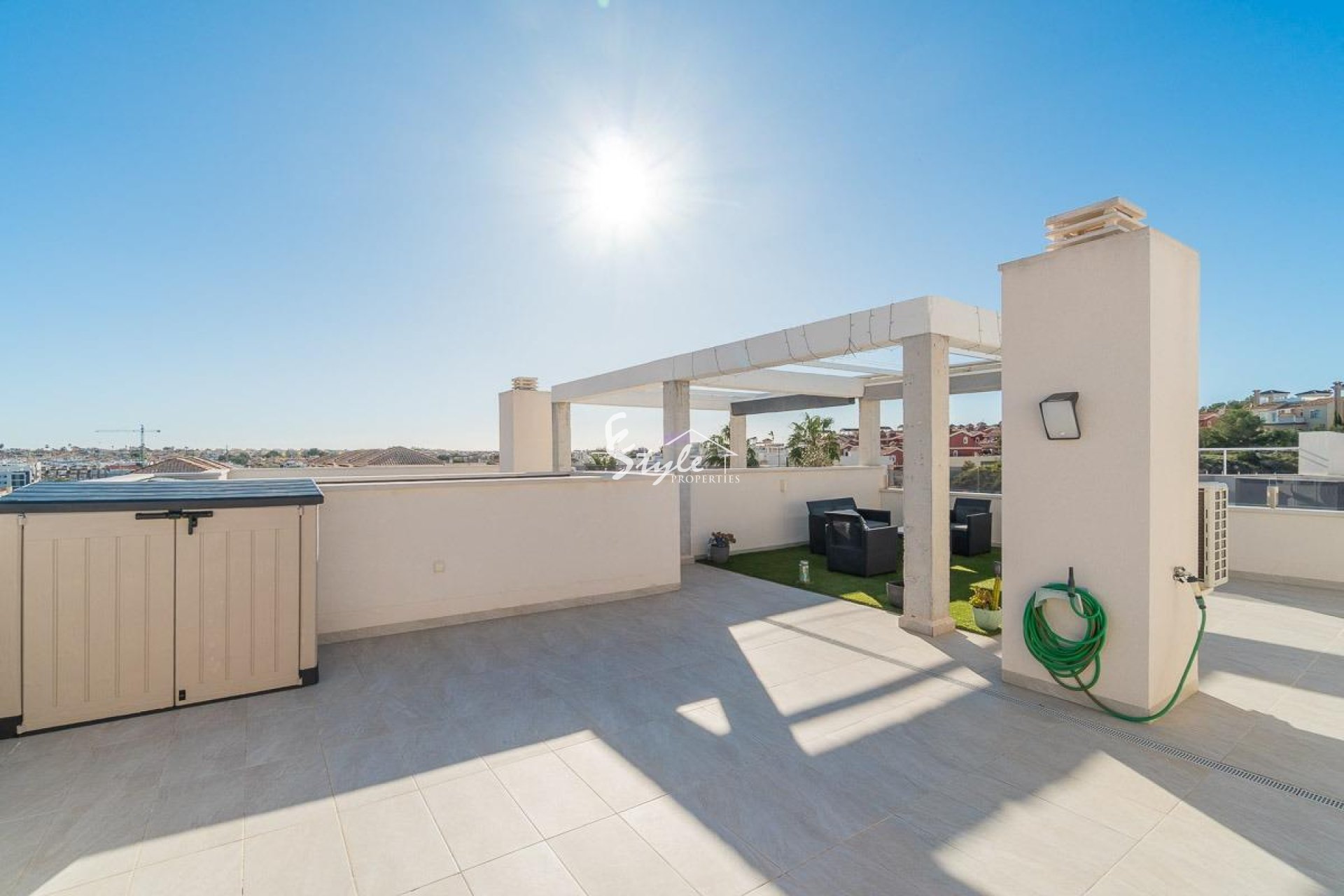 Откройте для себя этот великолепный бунгало на верхнем этаже, расположенный в престижном районе PAU 26, Ориуэла Коста, где современный дизайн, комфорт и высокое качество жизни идеально сочетаются.~~Эта практически новая недвижимость, построенная в 2022 году, имеет 76 м2 застроенной площади, удобную планировку и отличную южную ориентацию, обеспечивающую естественное освещение в течение всего дня.~~Дом находится в частном и эксклюзивном жилом комплексе всего на 24 квартиры, что гарантирует тишину, приватность и высокий уровень комфорта. При входе вас встречает светлая и просторная гостиная-столовая с современной кухней открытого типа. Из гостиной есть выход на балкон площадью 12 м2, оборудованный электрической маркизой и искусственным газоном, идеально подходящий для отдыха на свежем воздухе круглый год.~В доме также есть прачечная, две просторные спальни с двуспальными кроватями и две полностью оборудованные ванные комнаты, обе с теплыми полами.~~С балкона по частной лестнице можно подняться к главной жемчужине дома — впечатляющему частному солярию площадью около 71 м2, оформленному искусственным газоном и маркизами, идеальному для зоны отдыха или приема гостей под средиземноморским солнцем.~~Среди характеристик недвижимости: керамогранитные полы, москитные сетки на всех окнах, бронированная входная дверь, электрическая маркиза на балконе и ручная маркиза на перголе солярия.~~Недвижимость продается с парковочным местом и закрытым кладовым помещением, обеспечивая дополнительное удобство и место для хранения.~~Жилой комплекс предлагает красивый общий бассейн, очень ухоженные зеленые зоны и высококачественные общие пространства — настоящий уровень роскоши.~~Всего в 3,5 км от моря, рядом находятся одни из самых популярных пляжей Ориуэла Коста — Ла Зения и Плайя Фламенка, известные своей чистой водой и развитой инфраструктурой.~~Близость к престижным гольф-полям делает эту недвижимость очень востребованной для сезонной аренды и выгодной инвестицией.~~ Недвижимость, созданная для тех, кто ценит эксклюзивность, комфорт и средиземноморский образ жизни.~Уникальное предложение — свяжитесь с нами уже сегодня.~Цена: 349 000 €~Налоги и расходы на оформление покупки не включены (в соответствии с действующим законодательством). Подробная информация о дополнительных расходах будет предоставлена до бронирования.