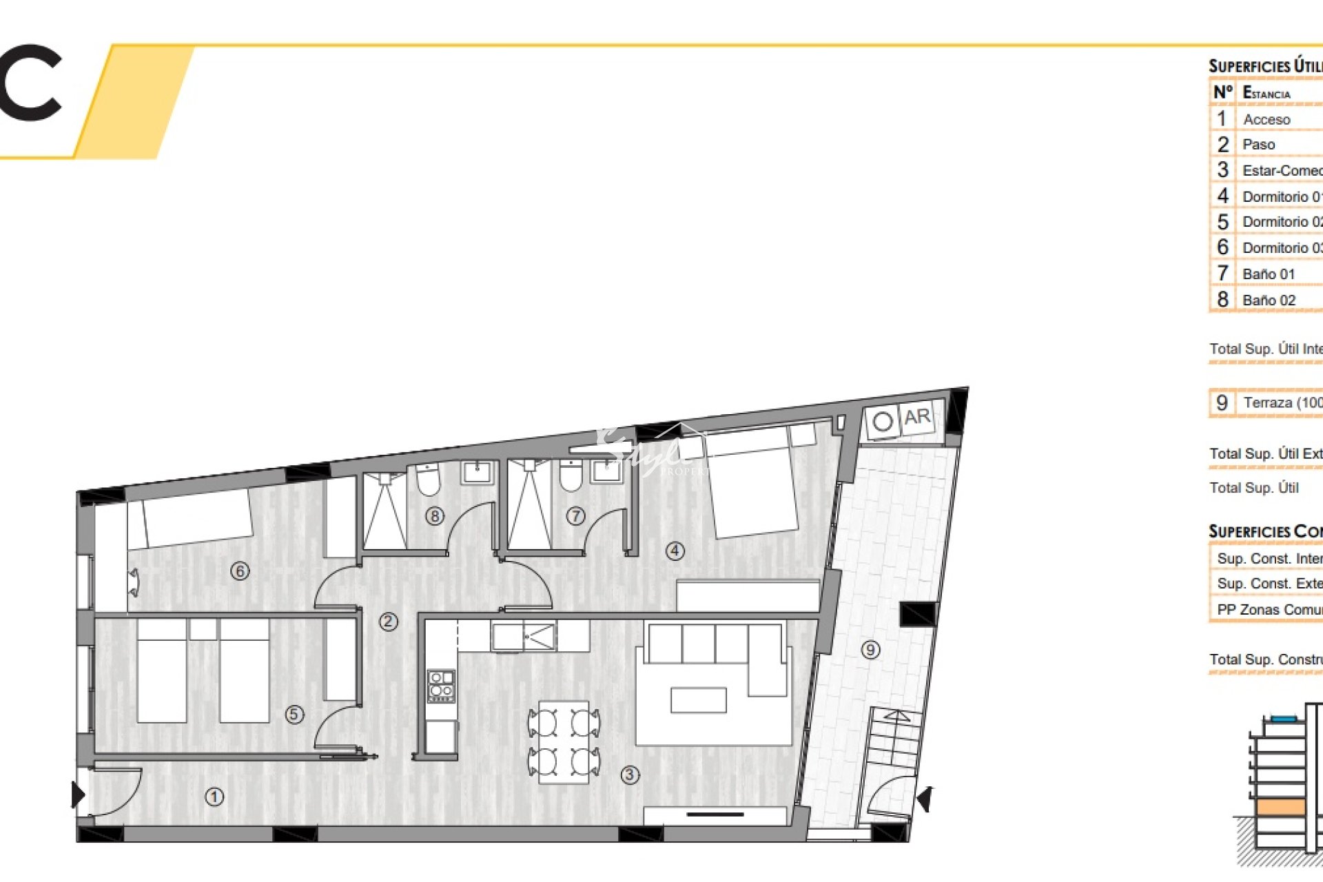 Внутри пентхаусы выделяются современным и функциональным дизайном. Полы из керамогранита придают элегантность и легки в уходе. Планировка включает варианты с 2 или 3 спальнями, адаптированные к различным семейным потребностям, и 2 ванные комнаты, обеспечивающие комфорт всех жителей. Встроенные шкафы предлагают эффективное хранение, а наличие бытовой техники на кухне облегчает повседневную жизнь. Возможность наличия опционального гаража добавляет элемент персонализации в соответствии с предпочтениями каждого покупателя.