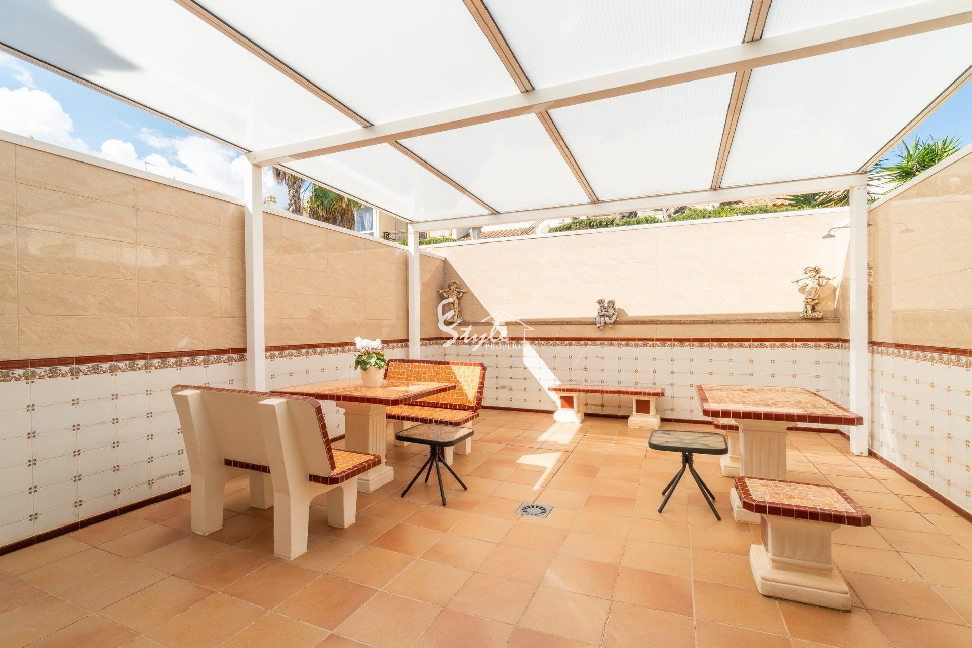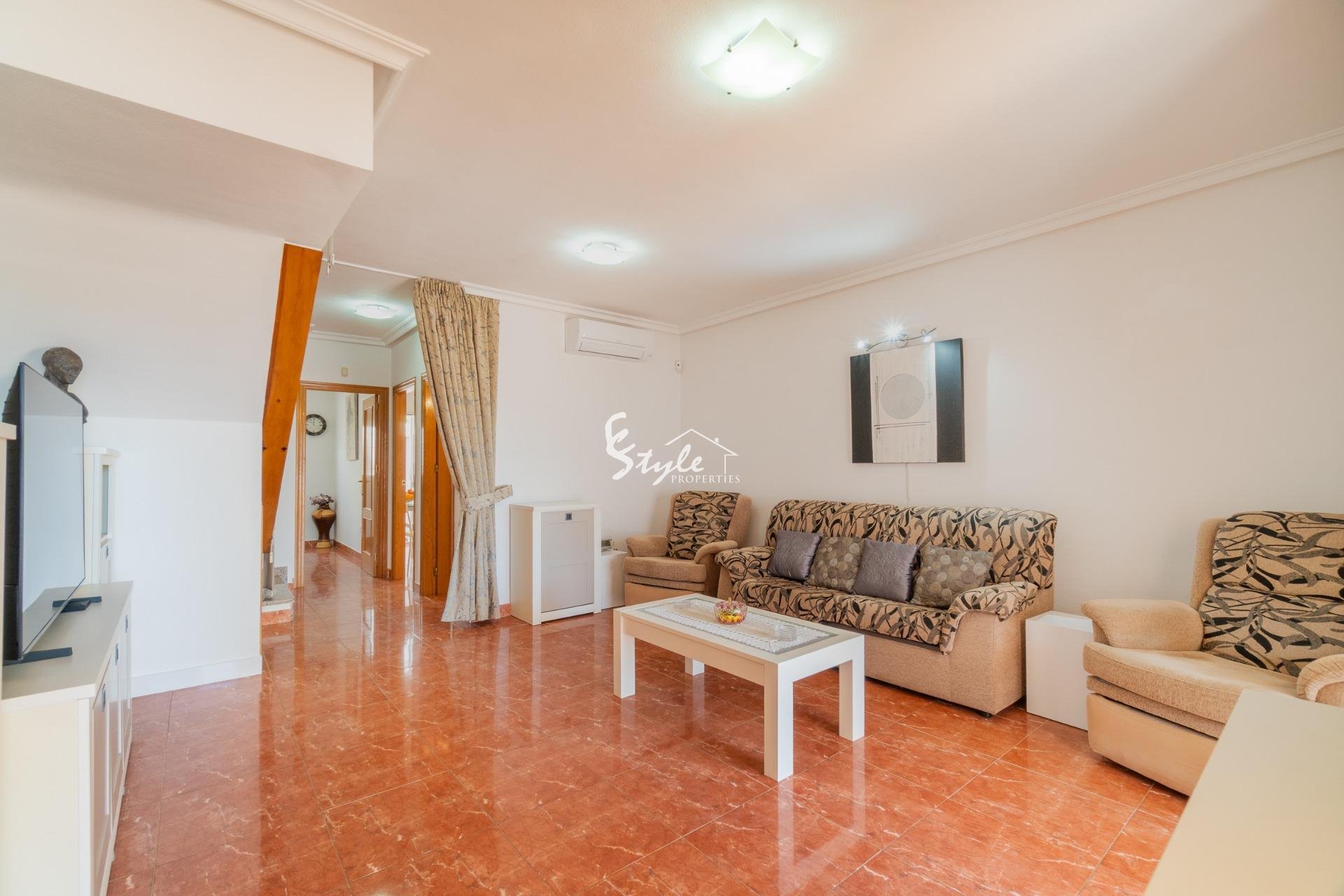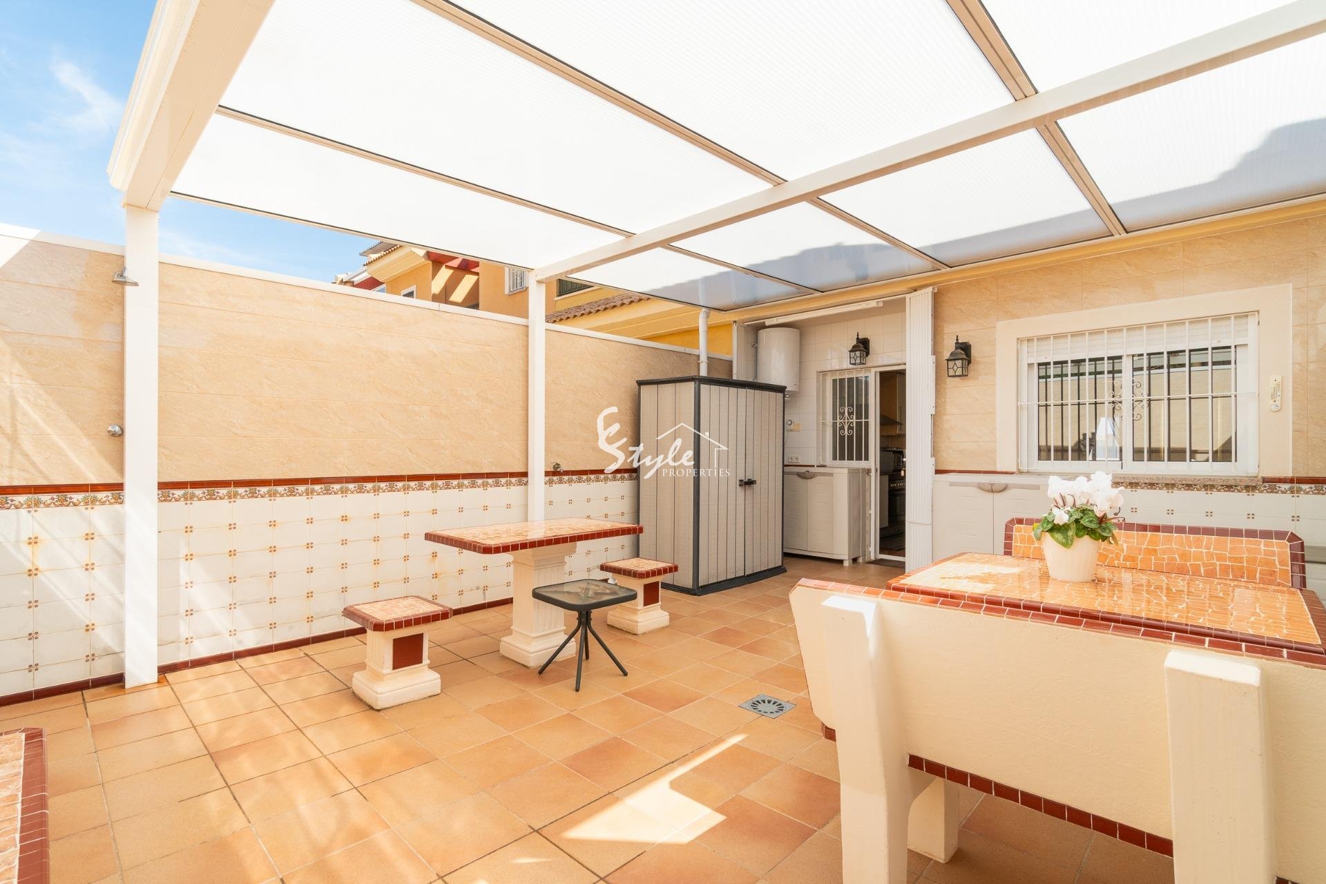 Представляем вашему вниманию этот фантастический таунхаус с 3 спальнями в эксклюзивном районе Вильямартин, идеальном месте для наслаждения солнцем и спокойствием Коста-Бланки. Площадь дома составляет 104 м2, а участок – 130 м2. Этот объект недвижимости предлагает все необходимое для комфортной жизни в непосредственной близости от всего, что для вас важно.~~На первом этаже расположены просторная и светлая гостиная-столовая, полностью оборудованная отдельная кухня с выходом на террасу, обращенную на запад, спальня и ванная комната с душем.~~На втором этаже находятся еще две спальни, каждая со своей террасой, и еще одна ванная комната с ванной.~~На третьем, верхнем этаже, расположена застекленная веранда площадью 15 м2, где вы можете наслаждаться солнцем весь день.~~Насладитесь собственным оазисом спокойствия на просторной террасе площадью 30 м2, идеально подходящей для отдыха или развлечений, а также солярием, чтобы в полной мере насладиться видами и прекрасной погодой. Кроме того, восточная ориентация гарантирует отличное естественное освещение в течение всего дня.~~Среди особенностей, выделяющих эту недвижимость, — кондиционер, встроенные шкафы, практичная прачечная и закрытая терраса на первом этаже, расширяющая жилое пространство и обеспечивающая больший комфорт. Также имеется большой и привлекательный общий бассейн, идеально подходящий для наслаждения теплыми днями и отдыха.~~Расположение превосходное, всего в 3,7 км от прекрасных пляжей Ла-Зения и Плайя-Фламенка, в окружении всей необходимой инфраструктуры: торговый центр La Zenia Boulevard находится в 3 минутах езды, а поблизости расположены супермаркеты, школы, больницы, парки и детские площадки. Вы также оцените близость к полю для гольфа Villamartín и удобный доступ к общественному транспорту.~~Этот дом продается полностью меблированным и включает в себя парковочное место на территории.~~Это идеальный вариант для тех, кто ищет функциональный, удобно расположенный дом со всем необходимым для немедленного заселения.~~Не упустите эту возможность! Свяжитесь с нами для получения дополнительной информации и организации просмотра.~Цена: 219 000 евро. Налоги и расходы по оформлению сделки не включены (в соответствии с действующим законодательством). Подробная информация о дополнительных расходах будет предоставлена до бронирования.~~В случае сделки с участием двух посредников, комиссионные сборы покупателя составят 1,5% от окончательной цены покупки, но не менее 3000 евро, плюс НДС (21%), если иное прямо не оговорено. Эти сборы не включены в указанную цену.