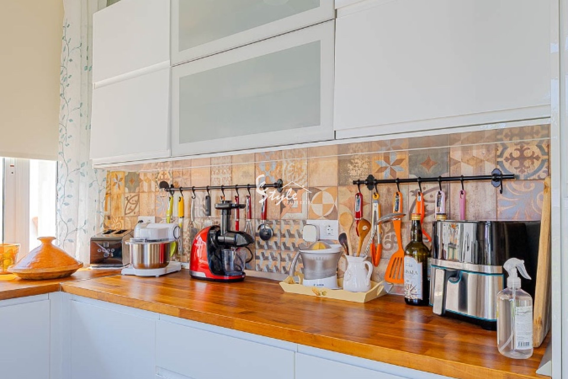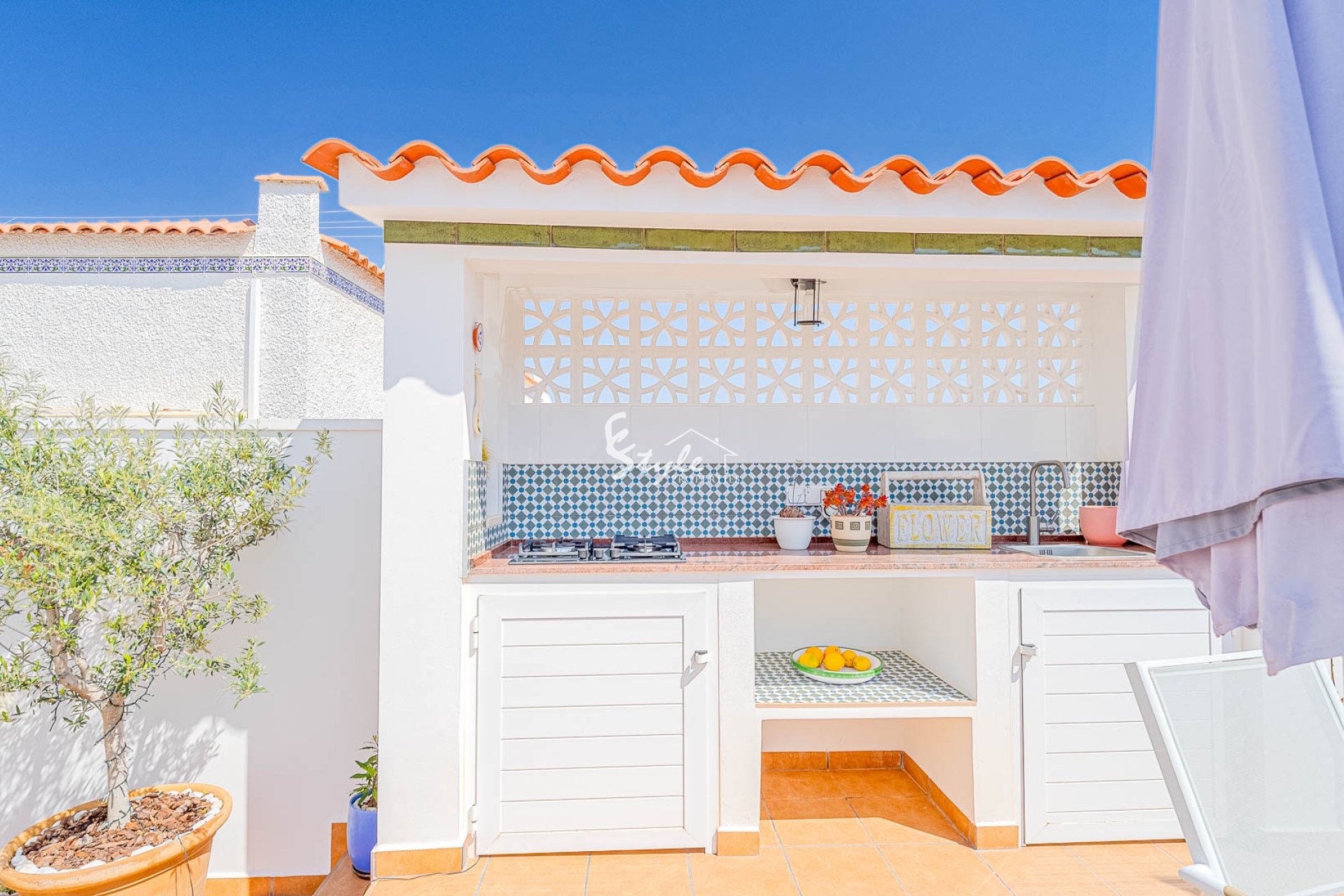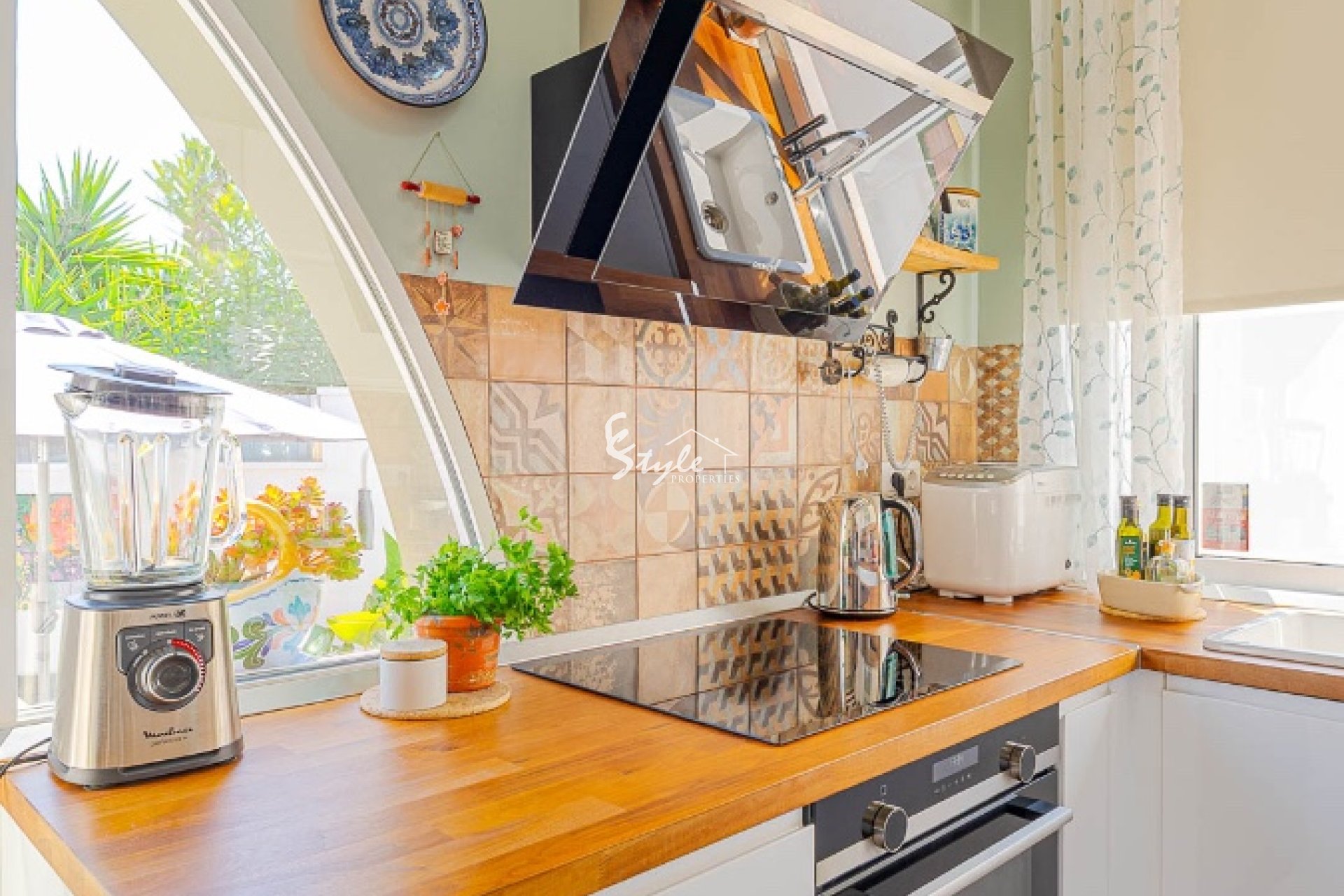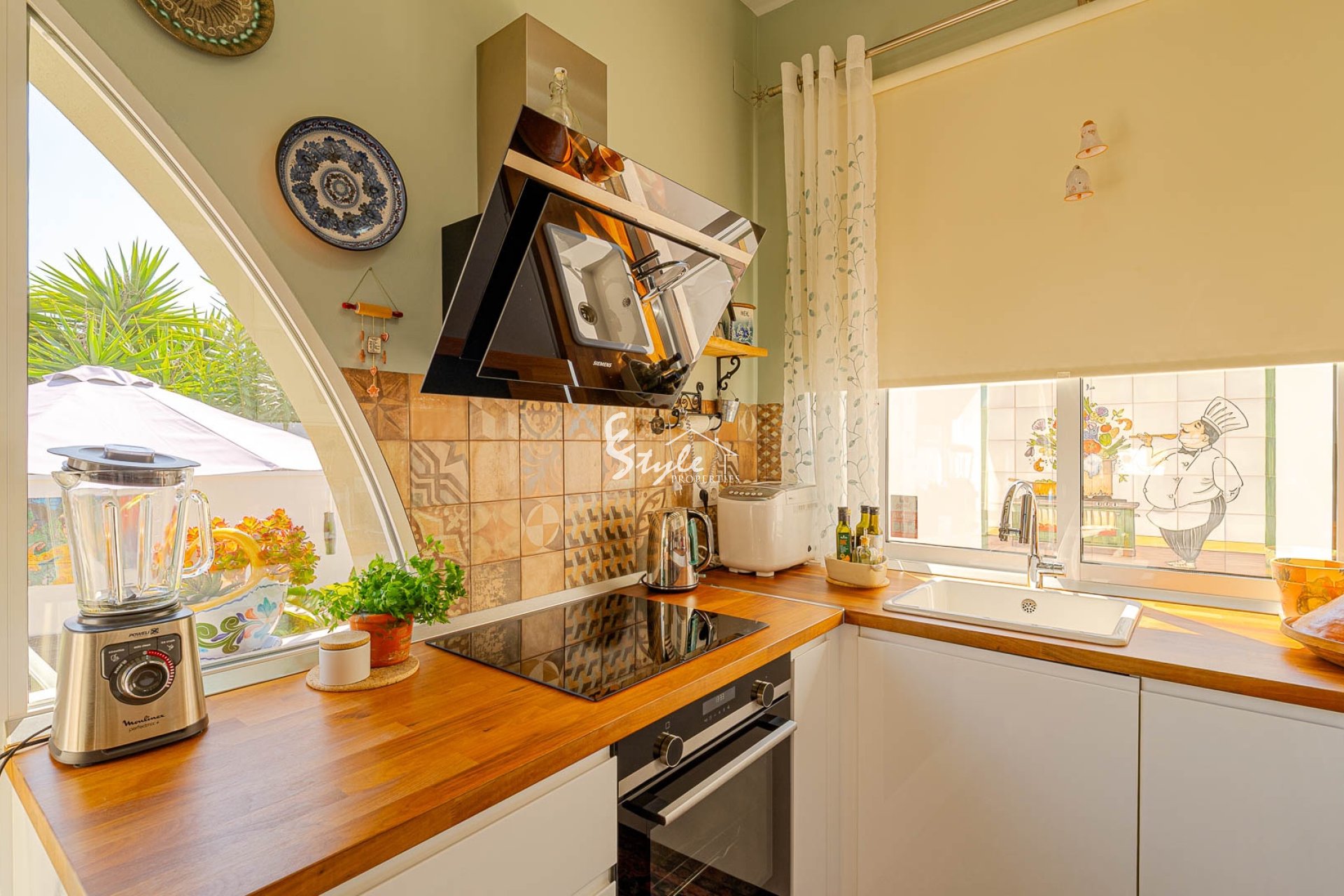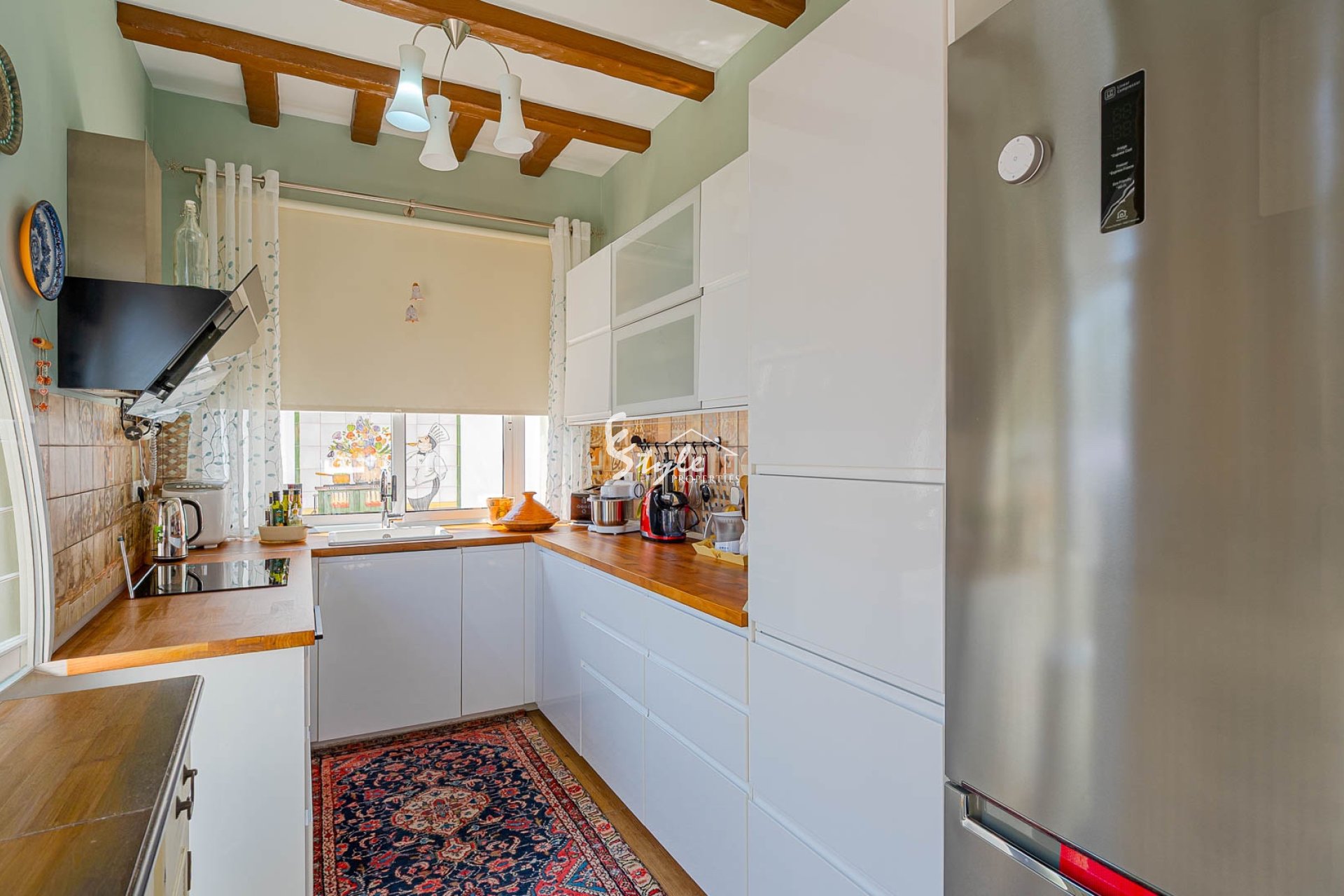 Дом включает летнюю кухню, наружный душ и стильную кухню с техникой Siemens и деревянными балками.
