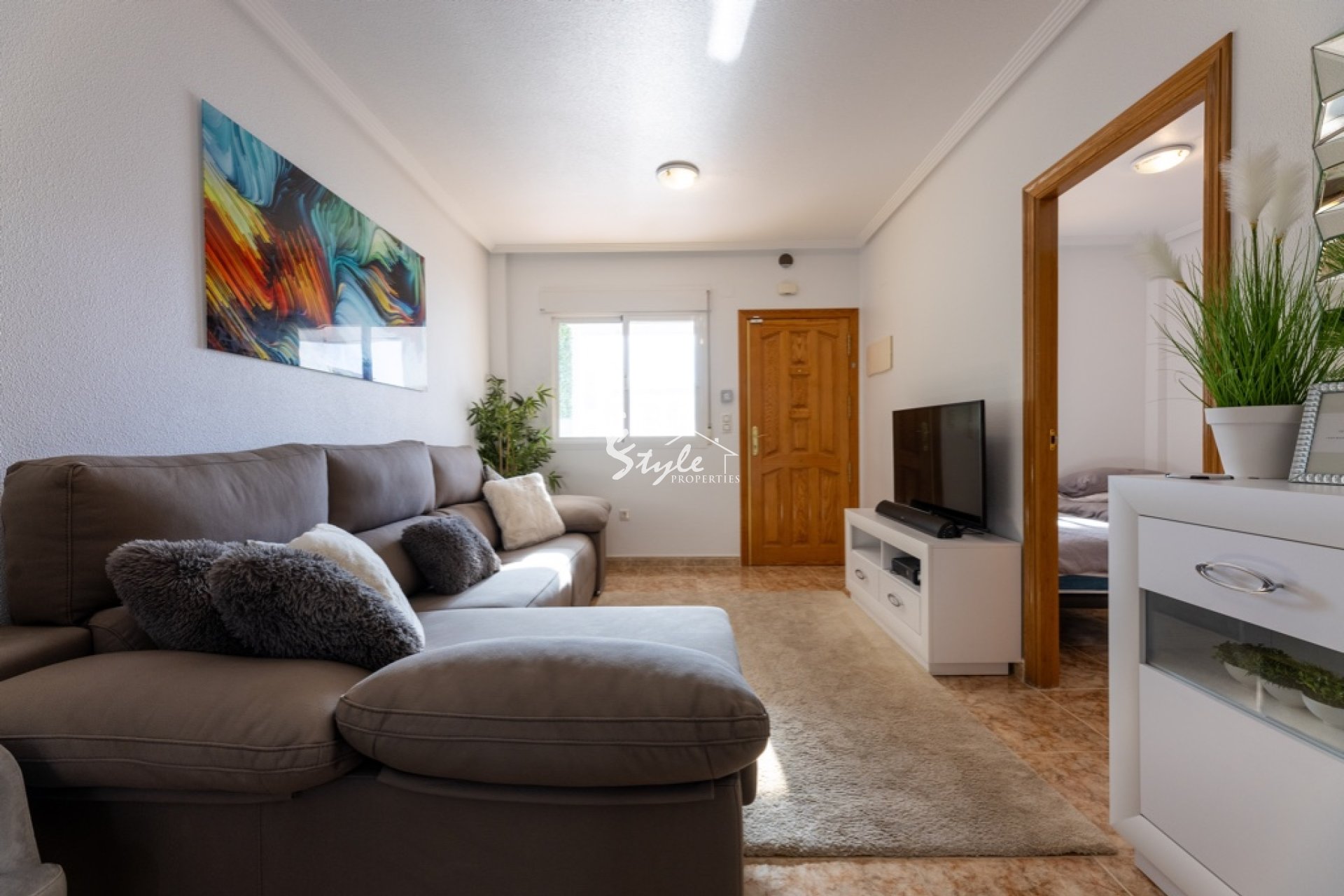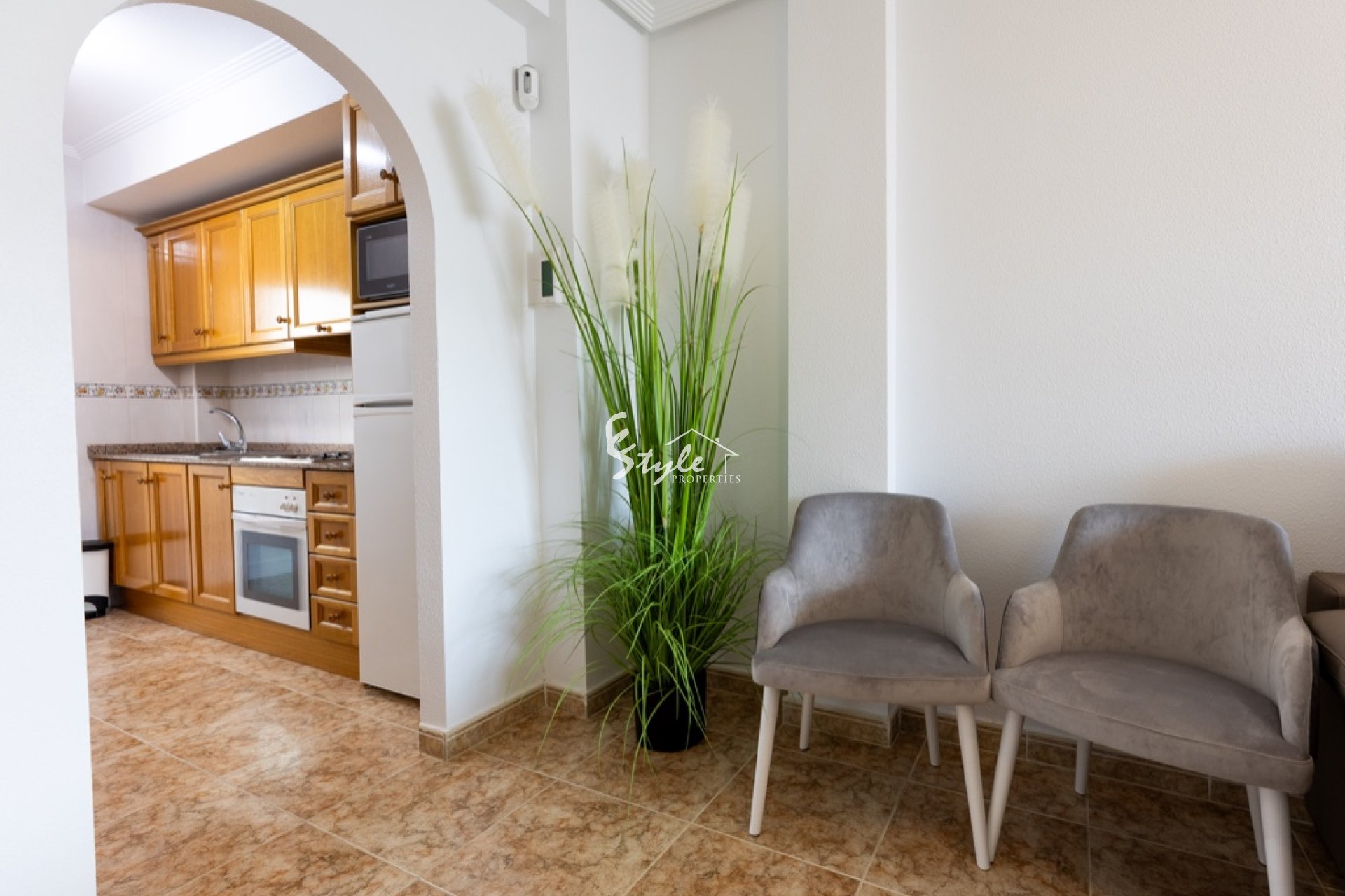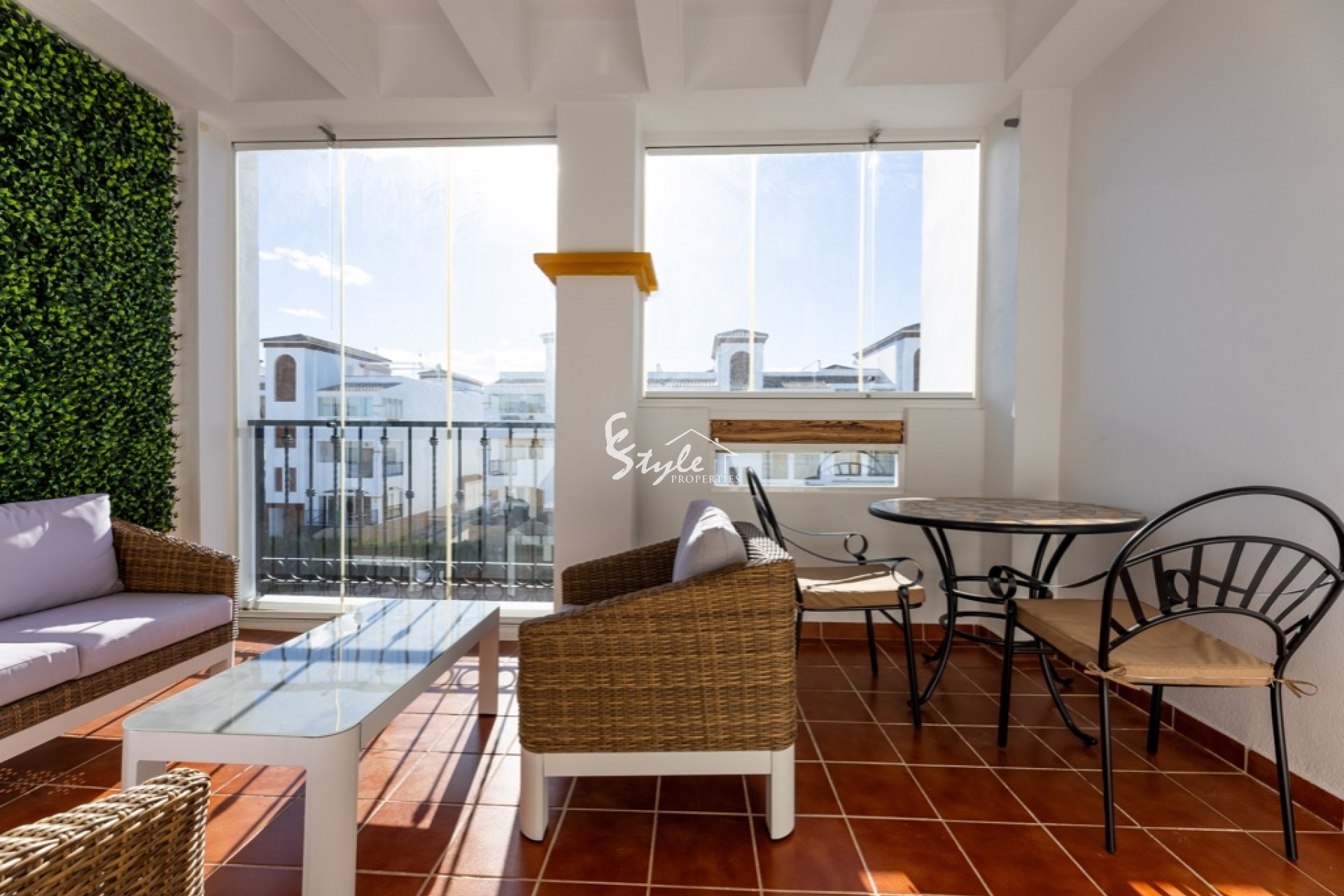 В квартире большая солнечная терраса с прекрасным видом на бассейн, 2 спальни, 1 ванная комната, отдельная кухня с кладовой, гостиная, а также индивидуальный просторный солярий на крыше.
