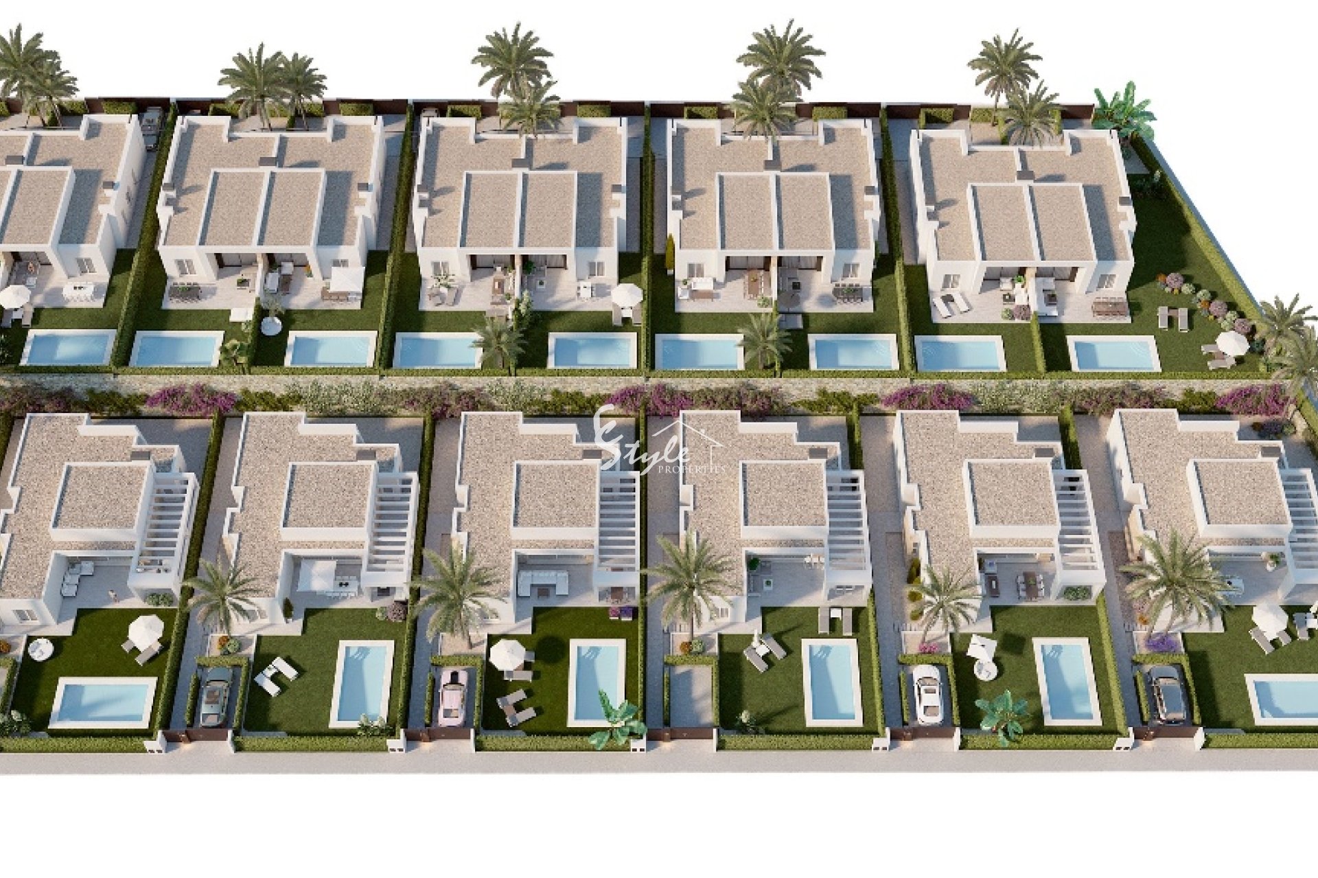 Виллы состоят из 3 спален и 2 ванных комнат, с большой гостиной зоной и кухней открытого плана. В главной спальне есть ванная комната. Каждая вилла имеет частный бассейн в дополнение к прекрасному общему бассейну урбанизации. Виллы оборудованы кондиционерами и подогревом полов, а также зеркалами в ванной комнате и душевой сеткой.