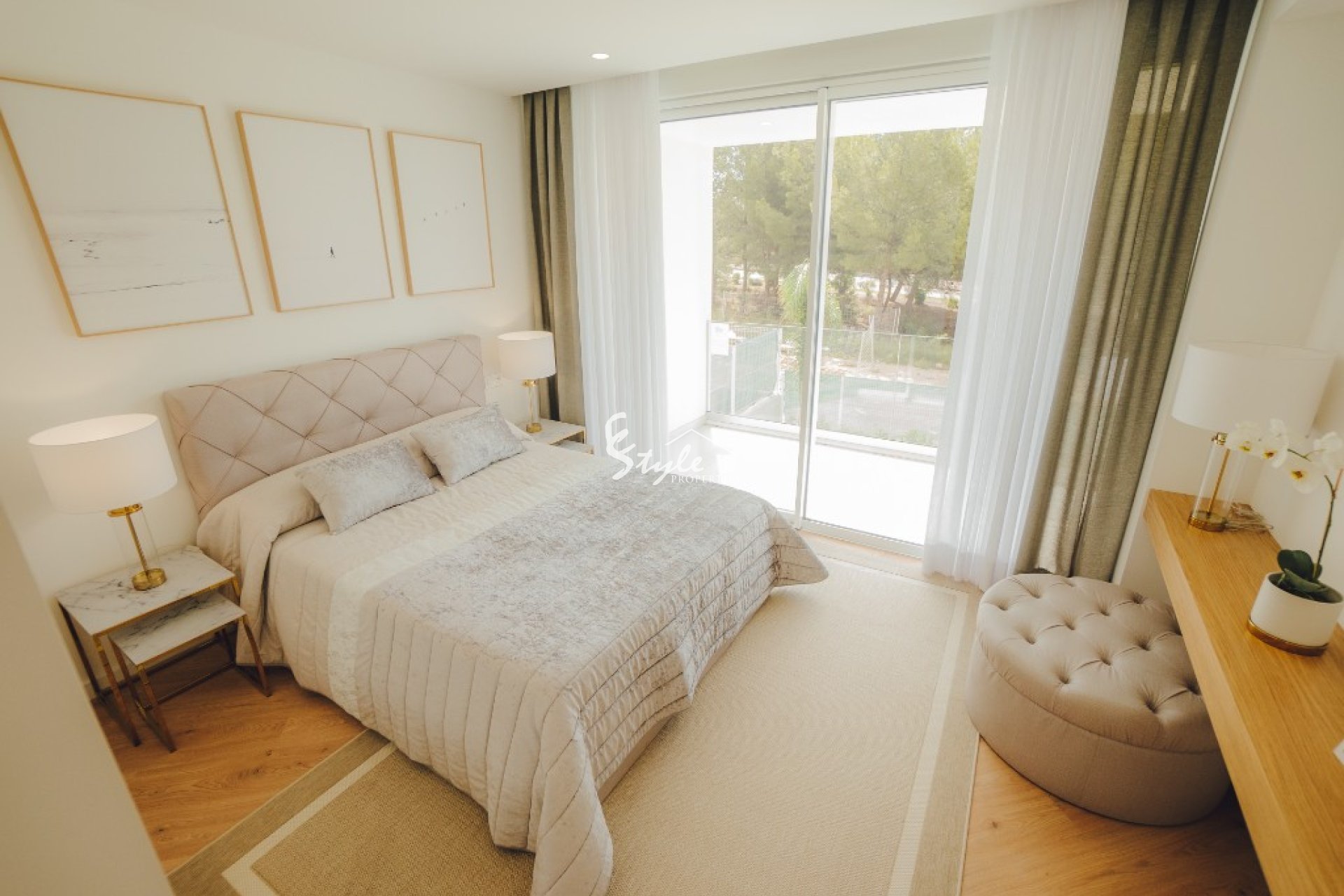 Каждый дом имеет 3 спальни и 3 ванные комнаты на двух уровнях. На первом этаже находится гостиная с открытой кухней, которая полностью оборудована техникой ведущих брендов, и большая спальня с ванной комнатой. Огромные панорамные окна позволяют каждый день наслаждаться естественным светом. Второй этаж состоит из двух спален и двух ванных комнат. На территории есть большой сад и частный бассейн, место для парковки.