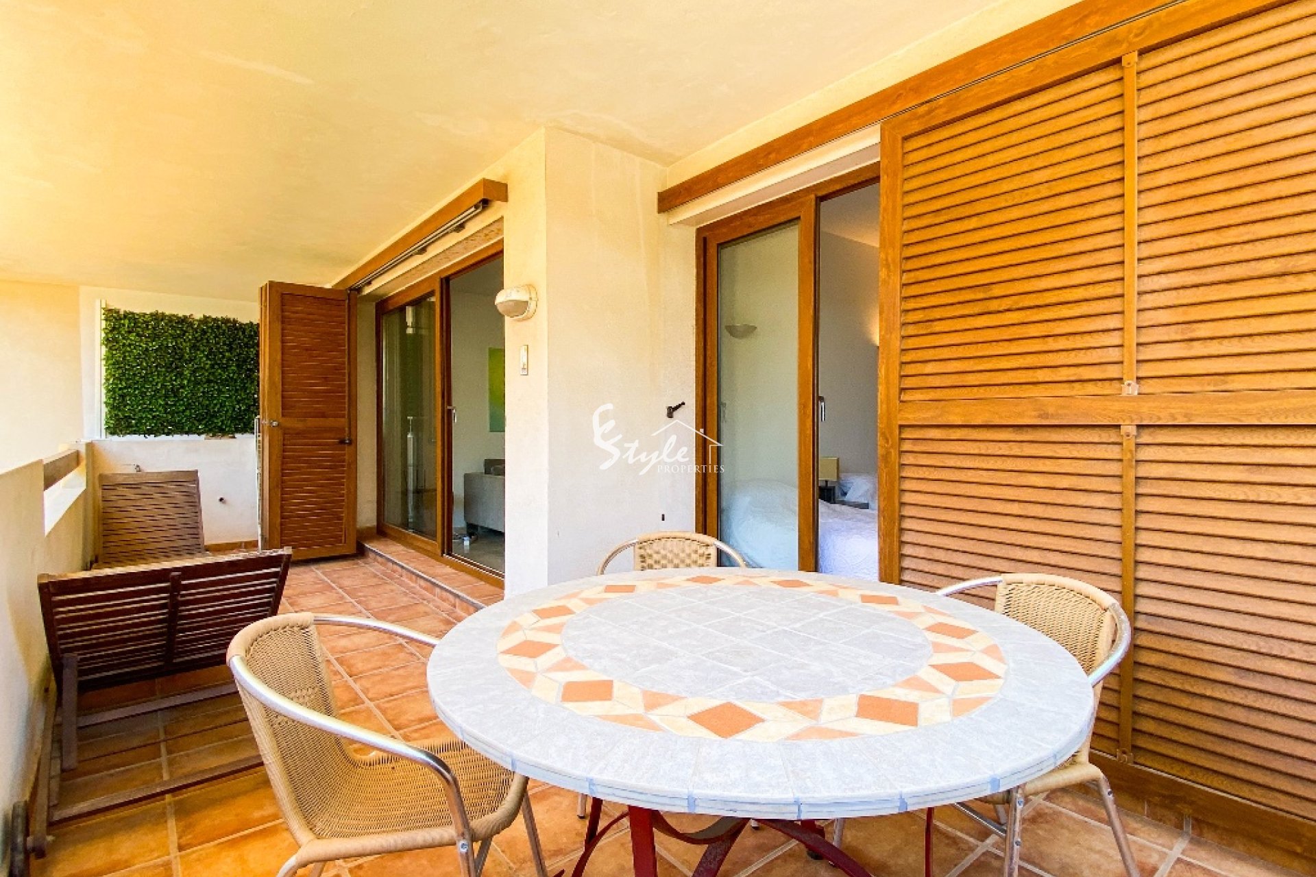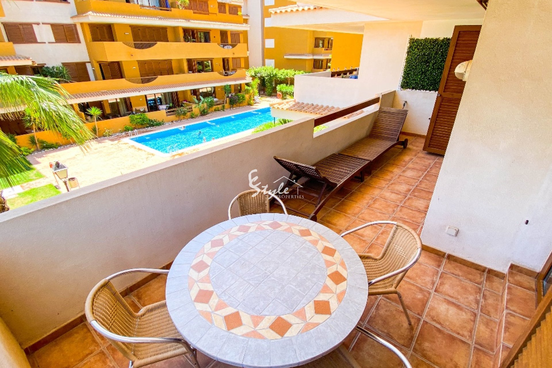 Квартира на продажу располагается в закрытом комплексе La Entrada, в окружении тропических садов. В квартире 2 спальни, 2 ванные комнаты, гостиная, кухня и терраса с видом на бассейн. Квартира продается полностью меблированной. В комплексе подземная парковка, 24-часовая охрана, ухоженная территория и большой общий бассейн.