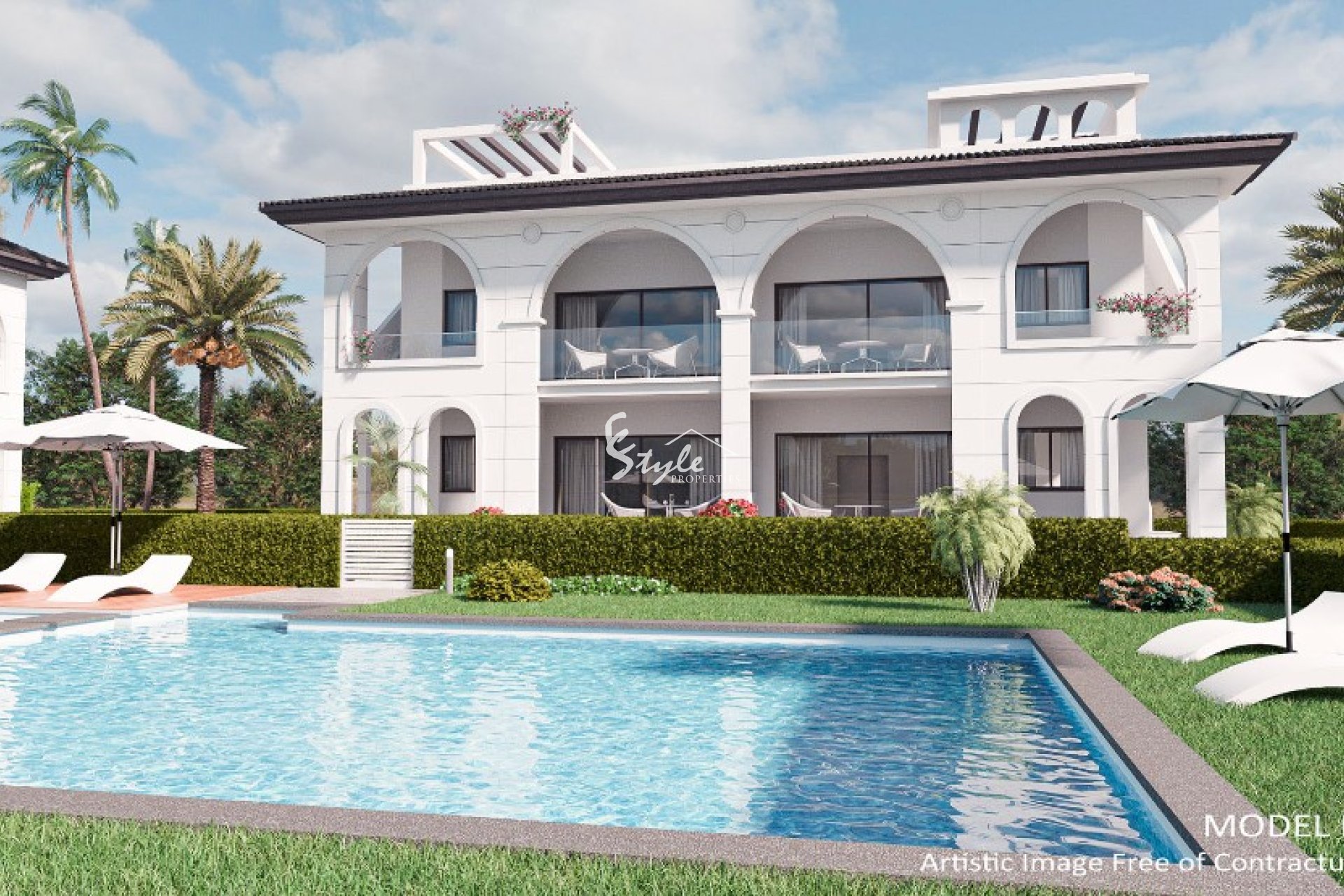 Апартаменты расположены в новостройке с очень уникальным и узнаваемым стилем. Это архитектура в стиле атриум, все двухэтажные здания расположены вокруг длинного общего бассейна, что означает, что каждая квартира имеет прекрасный вид из своего верхнего частного солярия или сада. Интерьер апартаментов состоит из 88 кв. метров, распределенных на 2 спальни, 2 ванные комнаты, светлый воздушный салон с современной встроенной кухней и частный участок площадью 110 кв. метров.