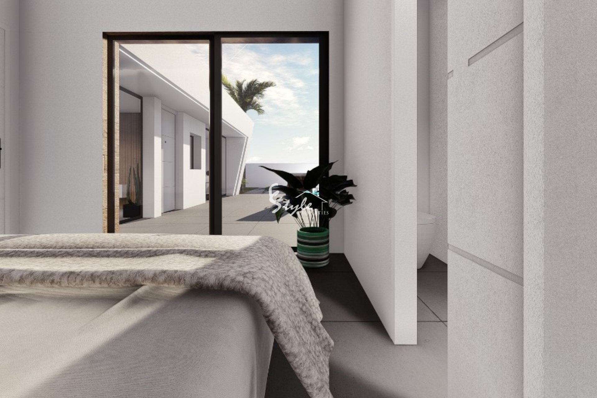 Одноэтажный дом состоит из гостиной-столовой, открытой кухни, 2 или 3 спален, 2 ванных комнат и солярия.